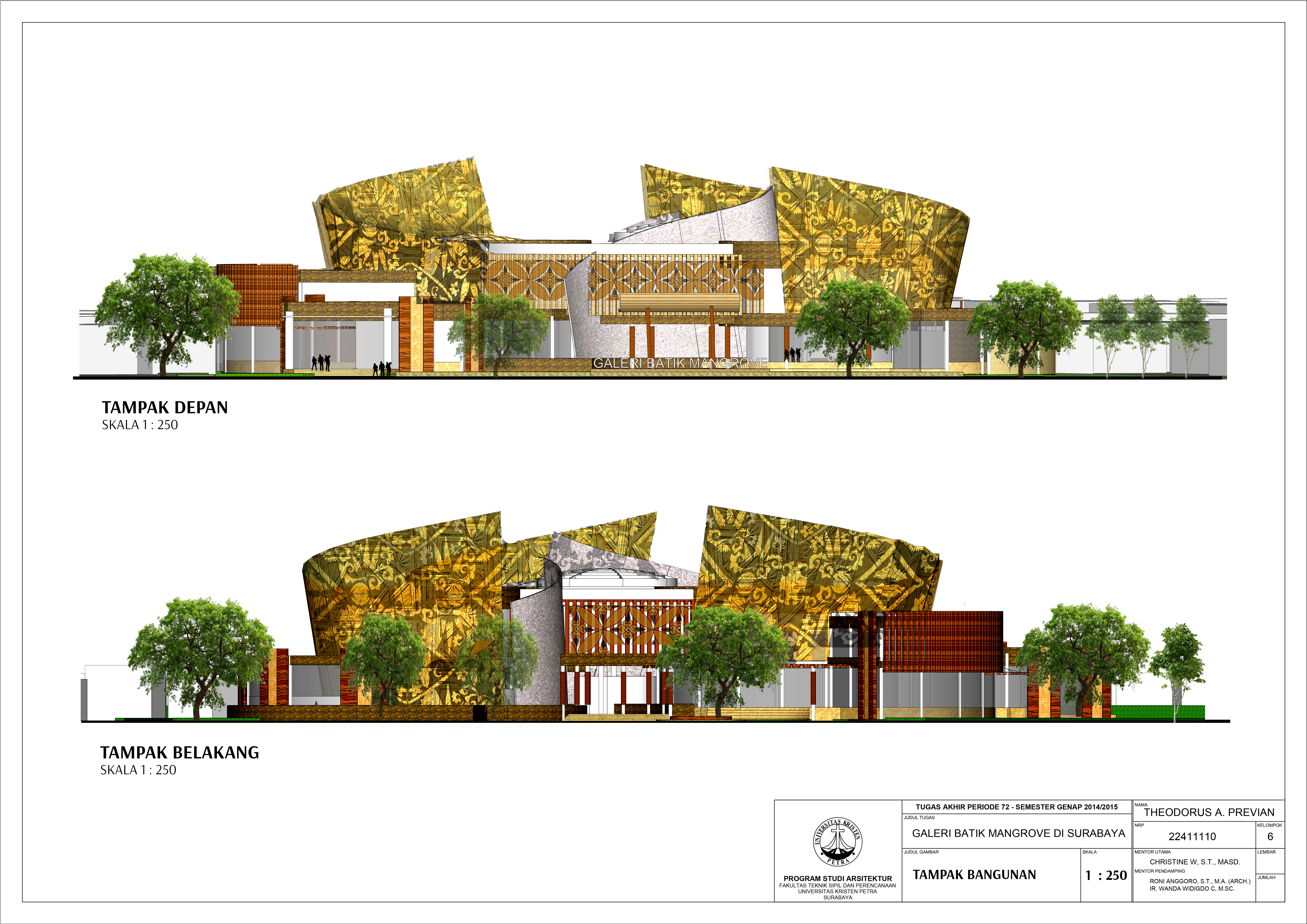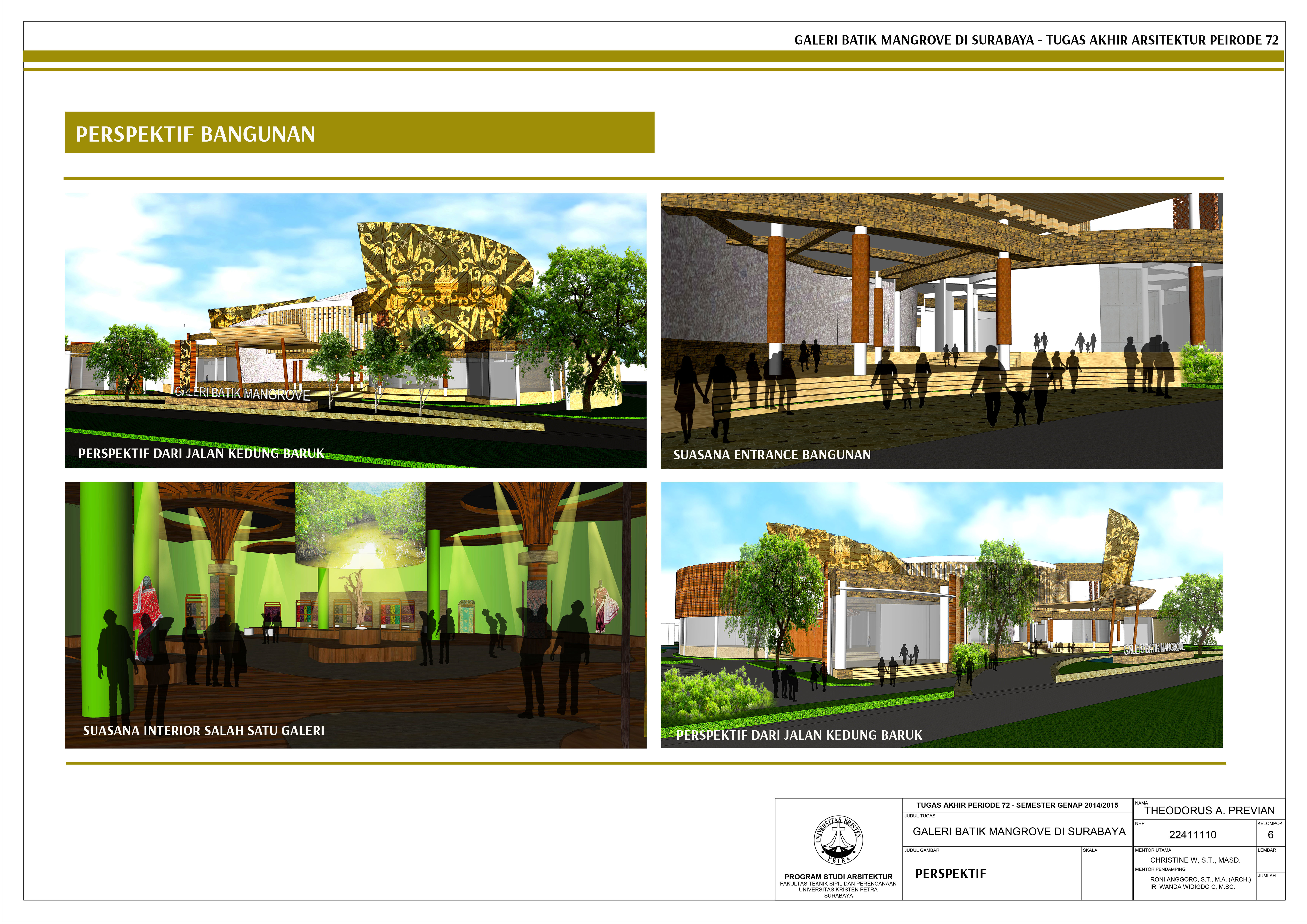 Proyek ini merupakan sebuah fasilitas galeri batik yang ditujukan untuk masyarakat Surabaya dan wisatawan baik dalam maupun luar negeri yang ingin mengetahui lebih dalam tentang batik mangrove khas Surabaya. Untuk dapat menarik pengunjung agar dapat membeli batik mangrove, maka yang harus diperkenalkan kepada pengunjung adalah keunikan dari batik mangrove. Rumusan masalah dari galeri ini adalah bagaimana memberikan informasi kepada pengunjung tentang keunikan batik mangrove melalui bentuk dan elemen arsitektur. Untuk menjawab permasalahan desain tersebut maka penulis menggunakan pendekatan arsitektur simbolik dan pendalaman karakter ruang. Diharapkan pengunjung dapat memahami keunikan dan makna dari batik mangrove sehingga mereka dapat mengapresiasi dan membeli batik mangrove.