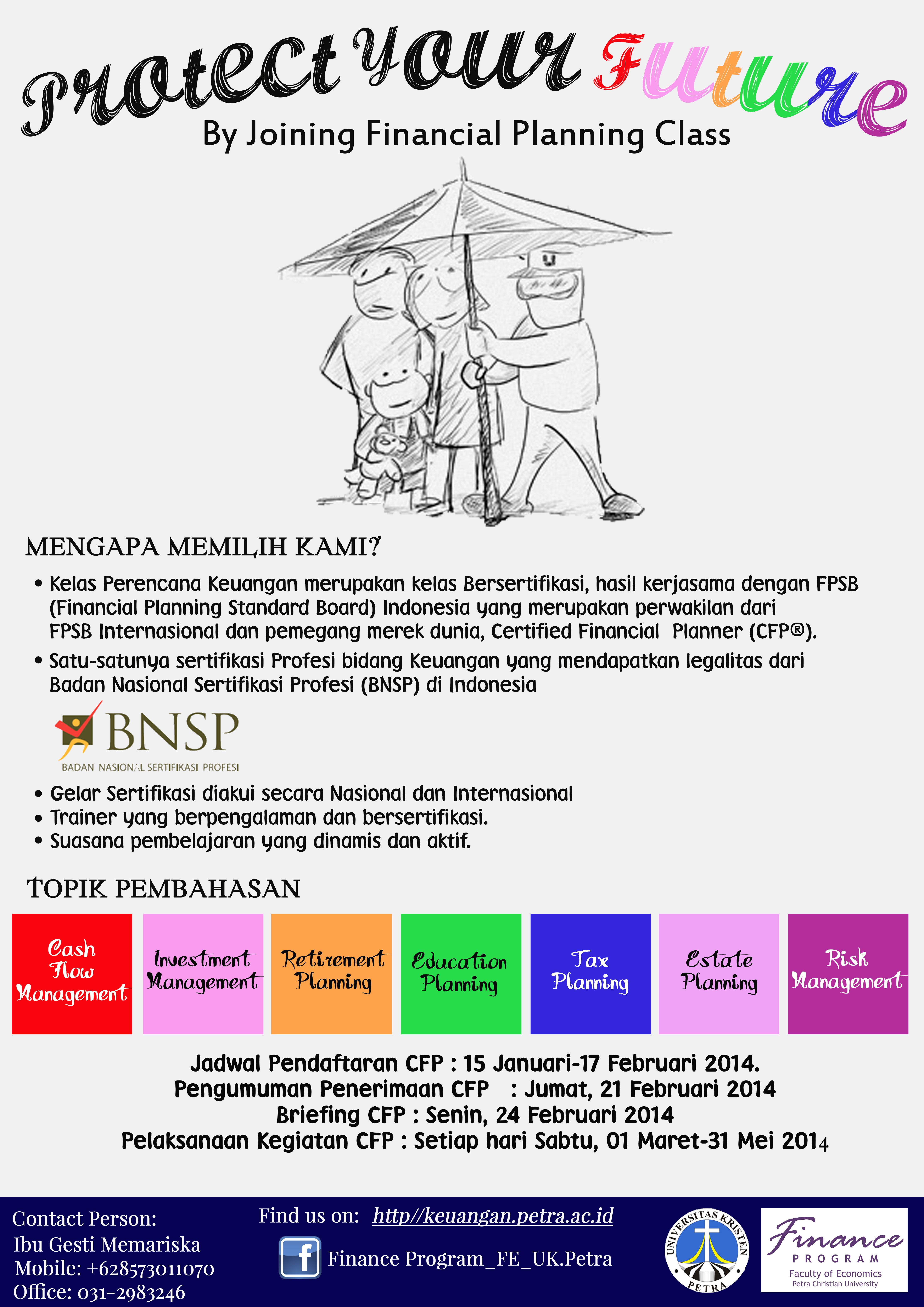 Program Studi Manajemen Keuangan UK Petra mengadakan Kelas Perencanaan Keuangan. Topik yang akan dibahas dalam kelas tersebut adalah Cash Flow management, investment manegement, retirement planning, education planning, tax planning, estate planning, risk management. Pendaftaran CFP dibuka mulai 15 Januari - 17 Februari 2014. Untuk informasi lebih lanjut dapat menghubungi Ibu Gesti Memariska di 08573011070 atau 031-2983246.