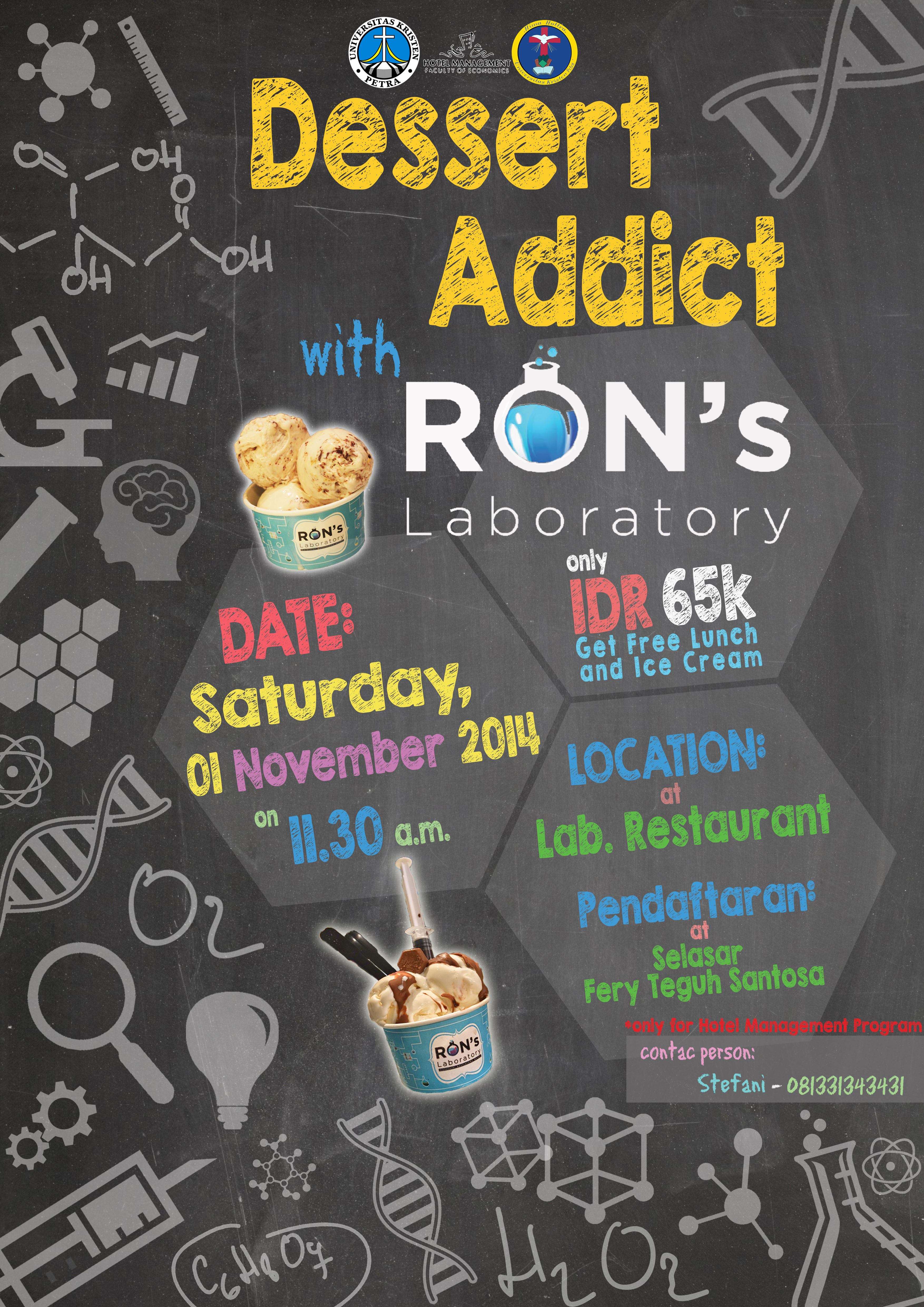 Program Studi Manajemen Perhotelan UK Petra mengadakan workshop dengan tema “Dessert Addict with Ron’s Laboratory”. Kegiatan ini dilakukan pada hari Sabtu, 1 November 2014 pada pukul 11.30 WIB. Dengan biaya kegiatan sebesar Rp 65.000, peserta juga akan mendapatkan makan siang gratis dan ice cream. Untuk informasi lebih lanjut dapat menghubungi Stefani (081331343431).