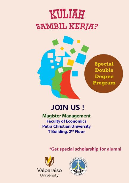 Kuliah sambil kerja ? Bergabunglah di Magister Manajemen Fakultas Ekonomi UK Petra, digedung T lantai 2. Dapatkan beasiswa special untuk alumni. Program ini berkat kerjasama UK Petra dengan Valparaiso University.