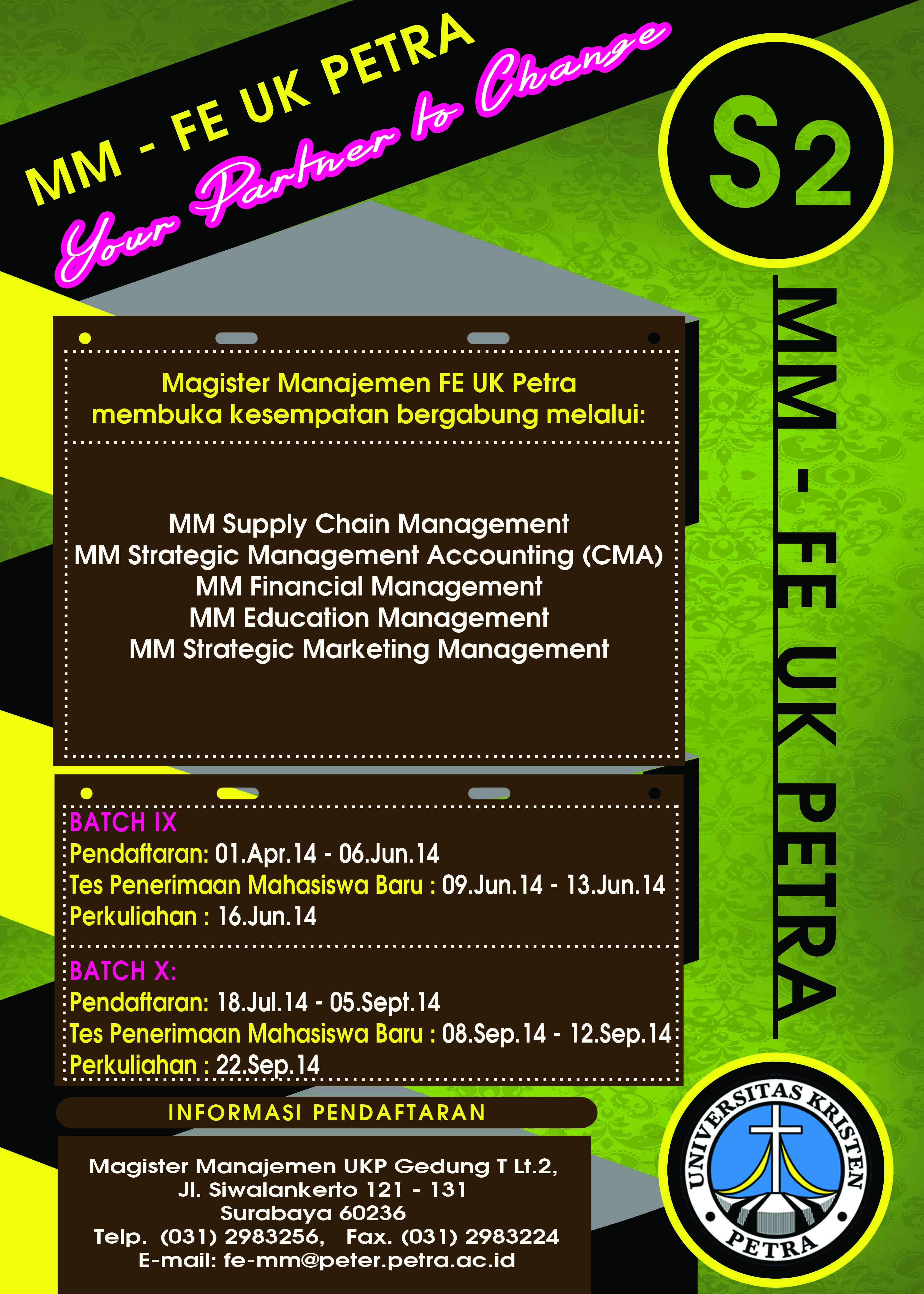 Magister Manajemen FE UK Petra membuka kesempatan bergabung melalui MM Supply Chain Management, MM Strategic Management Accounting (CMA), MM Financial Management, MM Education Management, dan MM Strategic Marketing Management. Kegiatan tersebut dibagi menjadi 2 bagian, yaitu Batch IX berlangsung pada 1 April 2014 – 6 Juni 2014 dengan tes penerimaan mahasiswa baru pada tanggal 9 Juni 2014 – 13 Juni 2014 dan perkuliahan dimulai pada 16 Juni 2014. Batch X berlangsung pada 18 Juli 2014 – 5 September 2014 dengan t es penerimaan mahasiswa baru pada tanggal 8 September 2014 – 12 September 2014 dan perkuliahan dimulai pada 22 September 2014. Informasi pendaftaran dapat menghubungi Magister Manajement UKP Gedung T lt.2 Jl. Siwalankerto 121-131 Surabaya 60236, atau dapat menghubungi di nomor (031)2983256/Fax (031)2983224, dan email dif e-mm@peter.petra.ac.id.