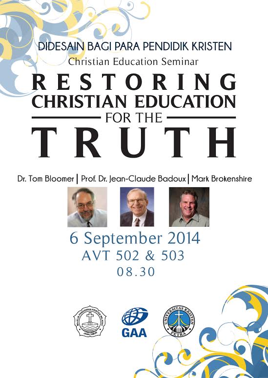Kegiatan berupa seminar ini didesain bagi para pendidik Kristen. Dengan tema “Restoring Christian Education for the Truth”, seminar tersebut dihadiri Dr. Tom Bloomer,m Prof.Dr. Jean-Claude Badoux, dan Mark Brokenshire sebagai narasumber. Seminar ini dilaksanakan pada 6 September 2014 bertempat di AVT 502&503 pada pukul 08.0 WIB
