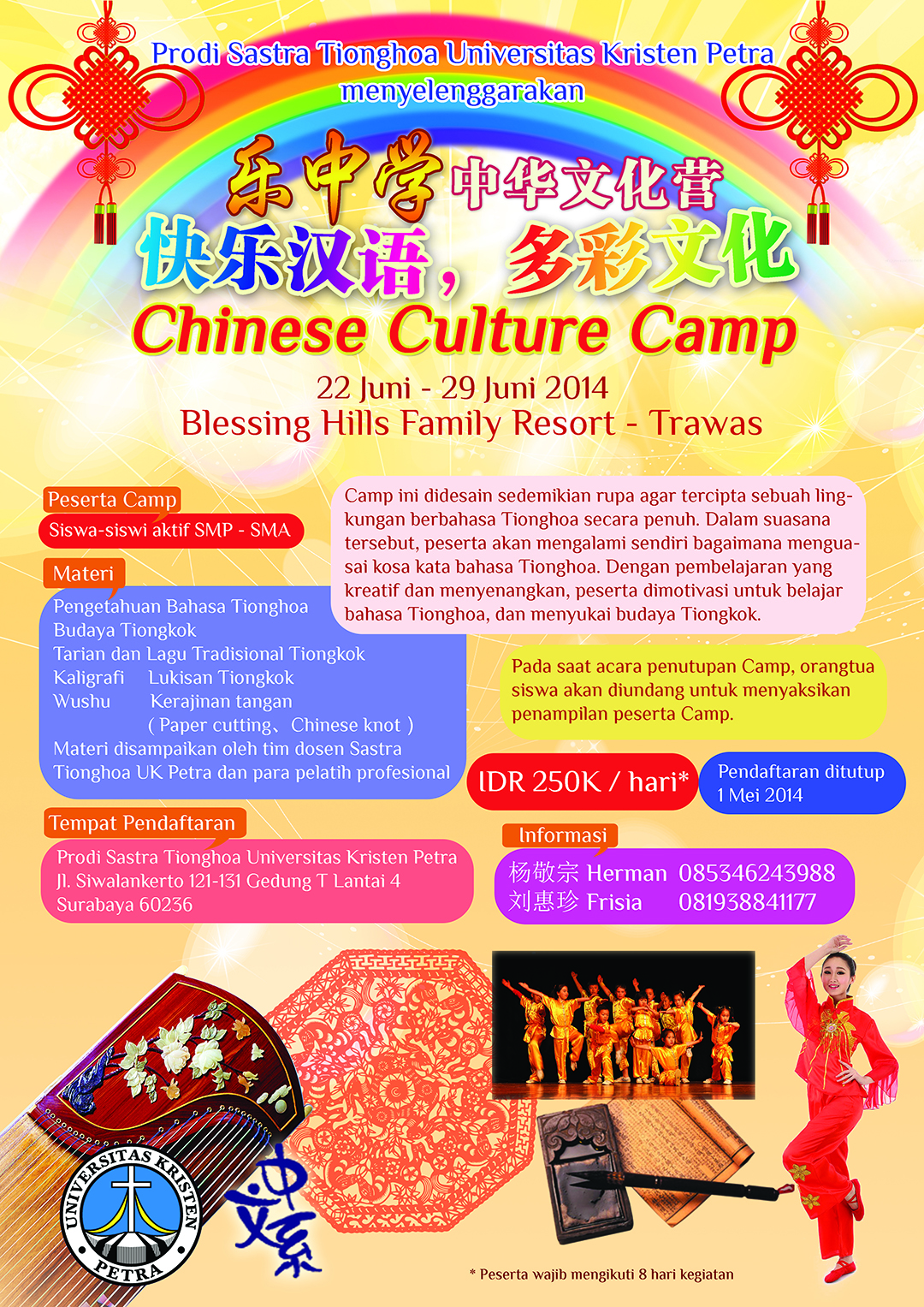 Prodi Sastra Tionghoa UK Petra mengadakan Chinese Culture Camps bertempat di Blessing Hills Family Resort, Trawas. Kegiatan dilaksanakan pada tanggal 22 Juni – 29 Juni 2014. Bagi siswa-siswi aktif SMP-SMA yang berminat, dapat melakukan pendaftaran di Prodi Sastra Tionghoa UK Petra, Jl. Siwalankerto 121-131 Gedung T lantai 4, Surabaya dengan biaya Rp 250.000.