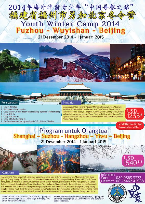 Prodi Sastra UK Petra menyelenggarakan Youth Winter Camp 2014 di Fozhou , Wuyishan dan Beijing, mulai tanggal 21 Desember 2014 – 1 Januari 2015. Kegiatan ini dikenakan biaya sebsr USD 1235. Prodi Sastra Tionghoa juga menyediakan program untuk orangtua dengan rute Shanghai, Suzhou, Hangzhou, Yiwu, Beijing, dan diselenggarakan pada 21 Desember 2014 – 1 Januari 2015. Untuk kegiatan ini dikenakan biaya sebesar USD 1540.