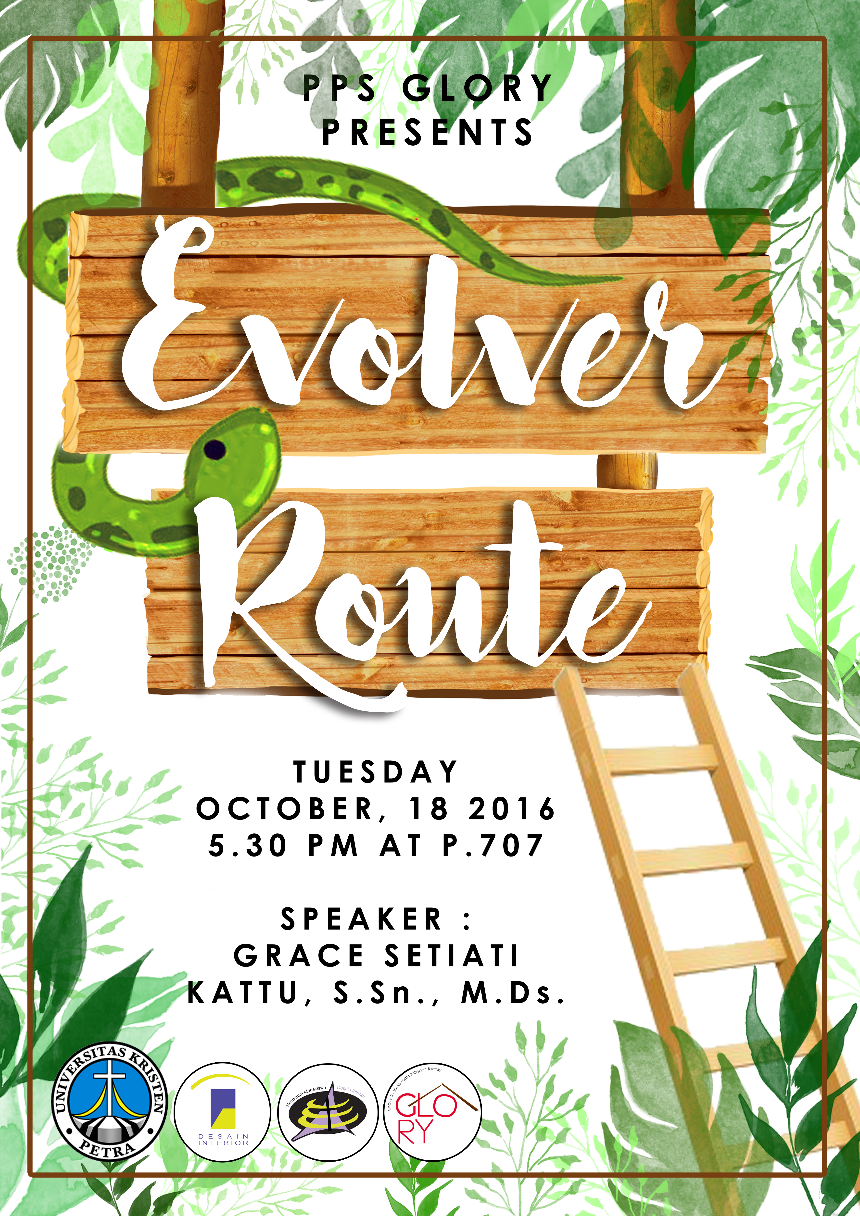 Persekutuan jurusan Glory Desain Interior UK Petra mengadakan kebaktian dengan mengangkat tema "Evolver route". Kebaktian diadakan pada 18 Oktober 2016 di gedung P.707 dan sebagai pembicara adalah ibu Grace Setiati Kattu.