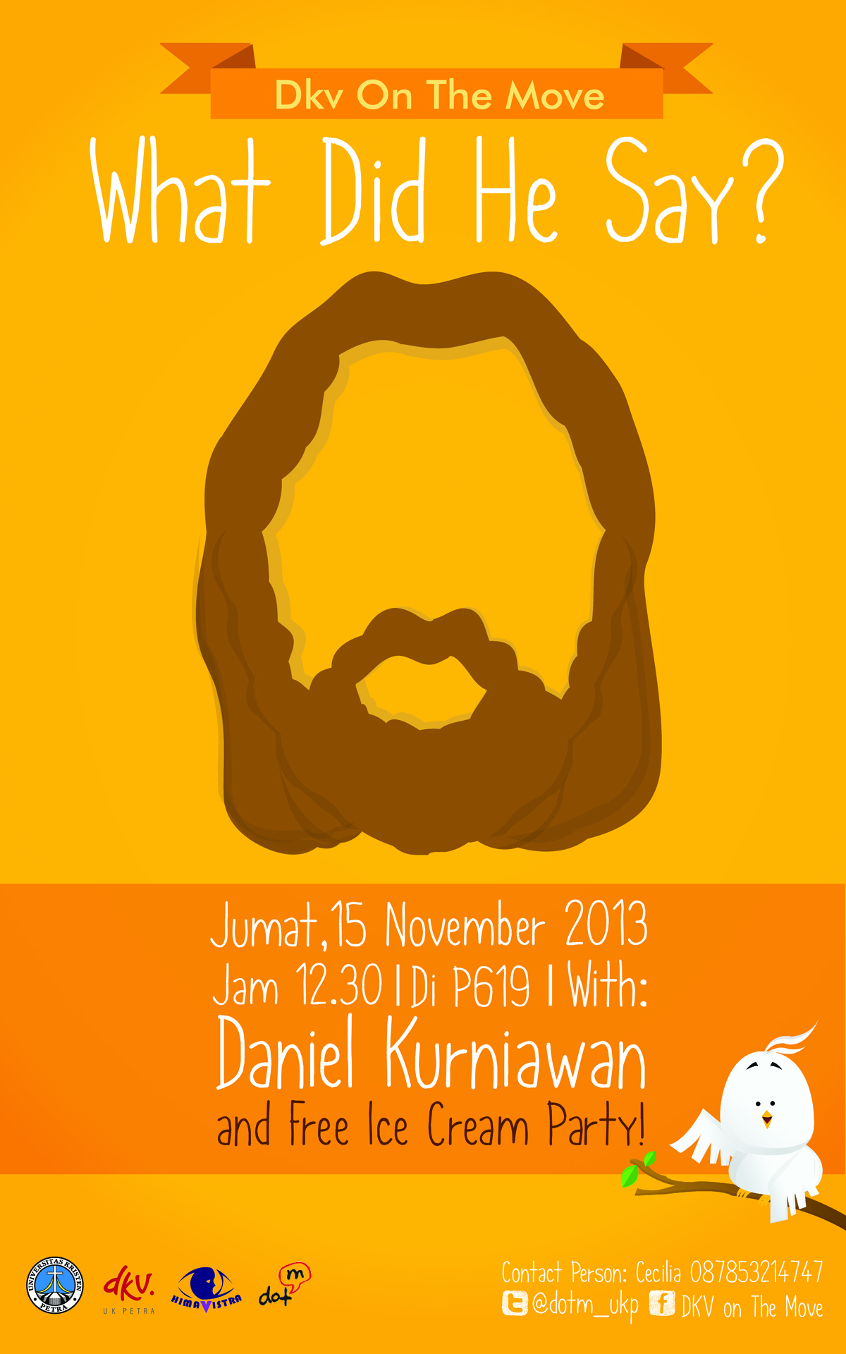 DKV On The Move mengadakan Persekutuan Program Studi dengan tema “What Did He Say?”, dengan pembicara Daniel Kurniawan. Kegiatan dilaksanakan pada hari Jumat, 12.30 bertempat di P.619.