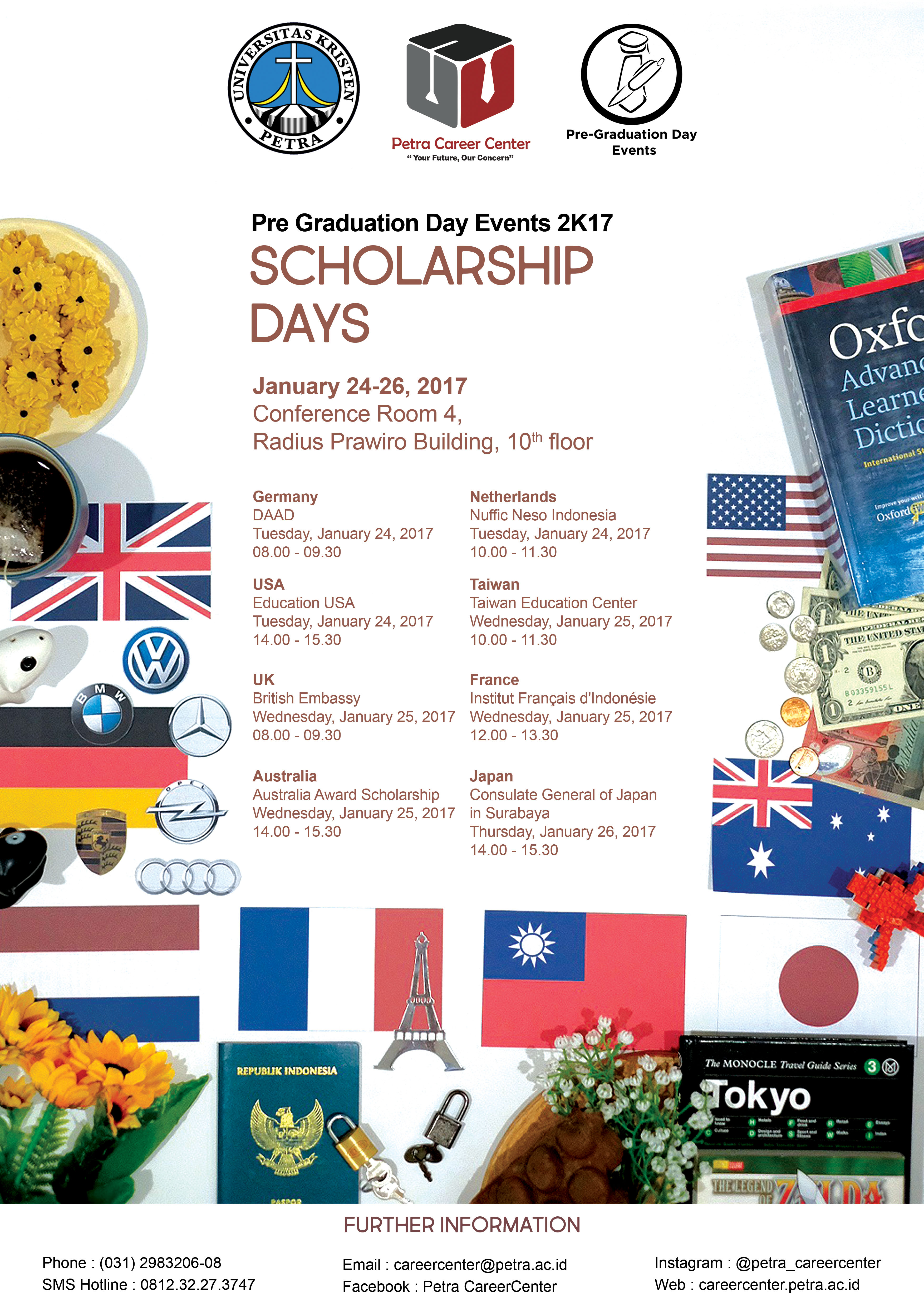 Pusat karir UK Petra mengadakan acara Scholarship Day yang dilaksanakan pada 24-26 Januari 2017 bertempat di RK IV gedung Radius Prawiro lantai 10. Acara ini diselenggarakan untuk menyambut wisuda UK Petra.
