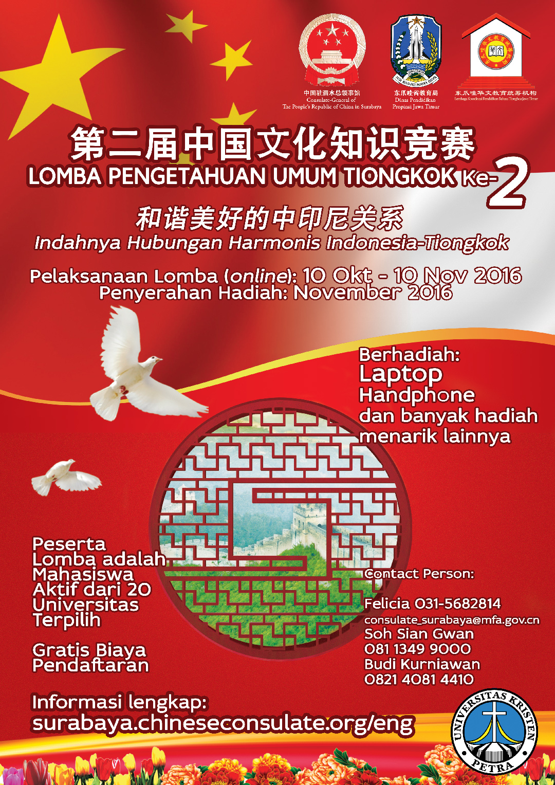 Program studi Sastra Tionghoa UK Petra Surabaya mengadakan lomba Pengetahuan Umum Tionghoa ke-2. Lomba ini mengangkat tema "Indahnya hubungan harmonis Indonesia-Tiongkok". Lomba diadakan pada tanggal 10 Oktober 2016 - 10 November 2016.