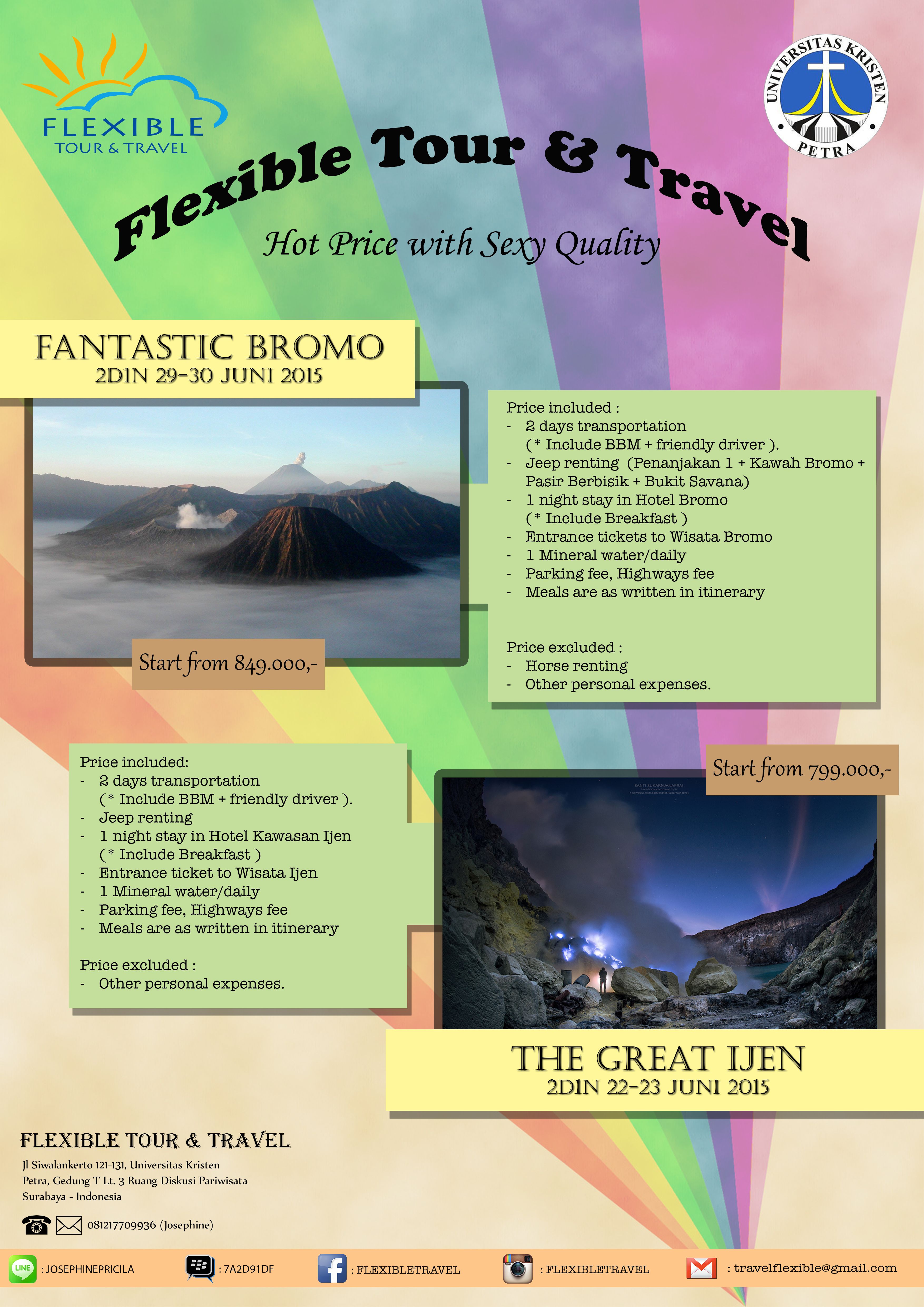 Flexible Tour & Travel, adalah kegiatan tur yang diselenggarakan oleh Program Studi Manajemen Pariwisata UK Petra. Kegiatan tersebut terbagi dalam 2 paket yang berbeda. Dengan membayar sebesar Rp 849.000, peserta tur dapat menikmati kegiatan “Fantastic Bromo”, dan dengan membayar sebesar Rp 799.000, peserta tur dapat menikmati kegiatan “The Great Ijen”. Fantastic Bromo dilaksanakan pada 29-30 Juni 2015 dan The Great Ijen dilaksankan pada 22-23 Juni 2015.