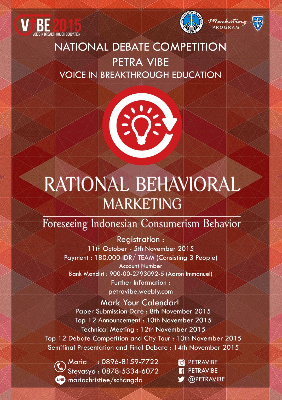program Studi Manajemen Pemasaran UK Petra, menyelenggarakan kegiatan lomba debat nasional dengan tema “National Debate Competition Petra Vibe Voice In Breakthrough Education: Rational Behavioural Marketing”. Biaya pendaftaran sebesar Rp 180.000/tim (3 orang).