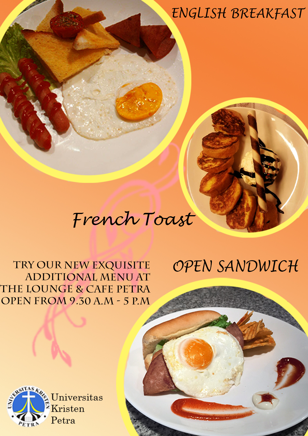 Manajemen Perhotelan UK Petra, menyelenggarakan kegiatan English Breakfast. Menu yang tersedia adalah french toast dan open sandwich. English Breakfast hanya tersedia pada pukul 9.30-17.00 bertempat di The Lounge & Cafe Petra.