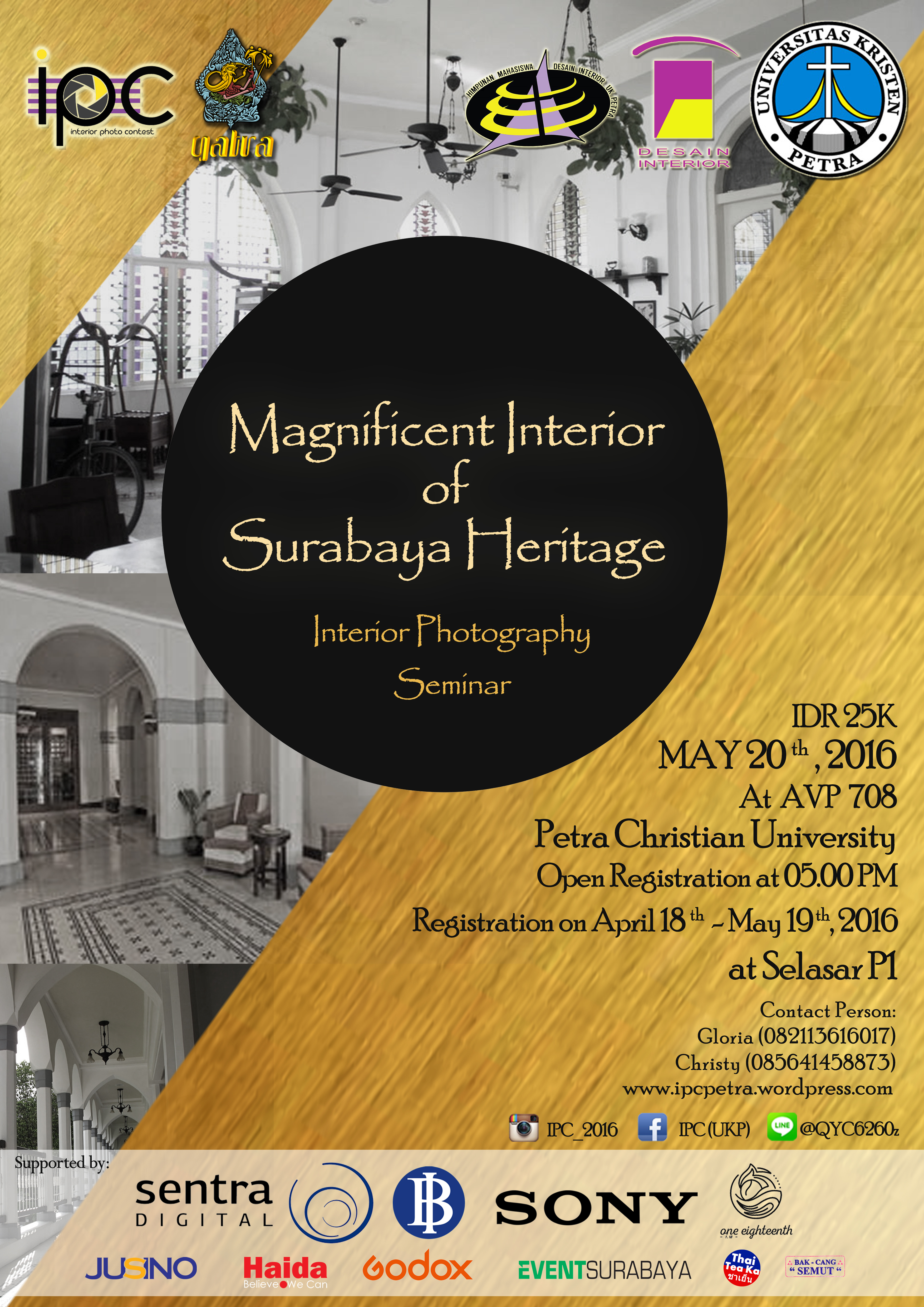 Jurusan Desain Interior Universitas Kristen Petra Surabaya mengadakan seminar dengan tema Magnificent Interior of Surabaya Heritage. Seminar diadakan pada 20 Mei 2016 bertempat di AV. P. 708. Universitas Kristen Petra Surabaya. Dengan biaya pendaftaran 25 ribu rupiah.