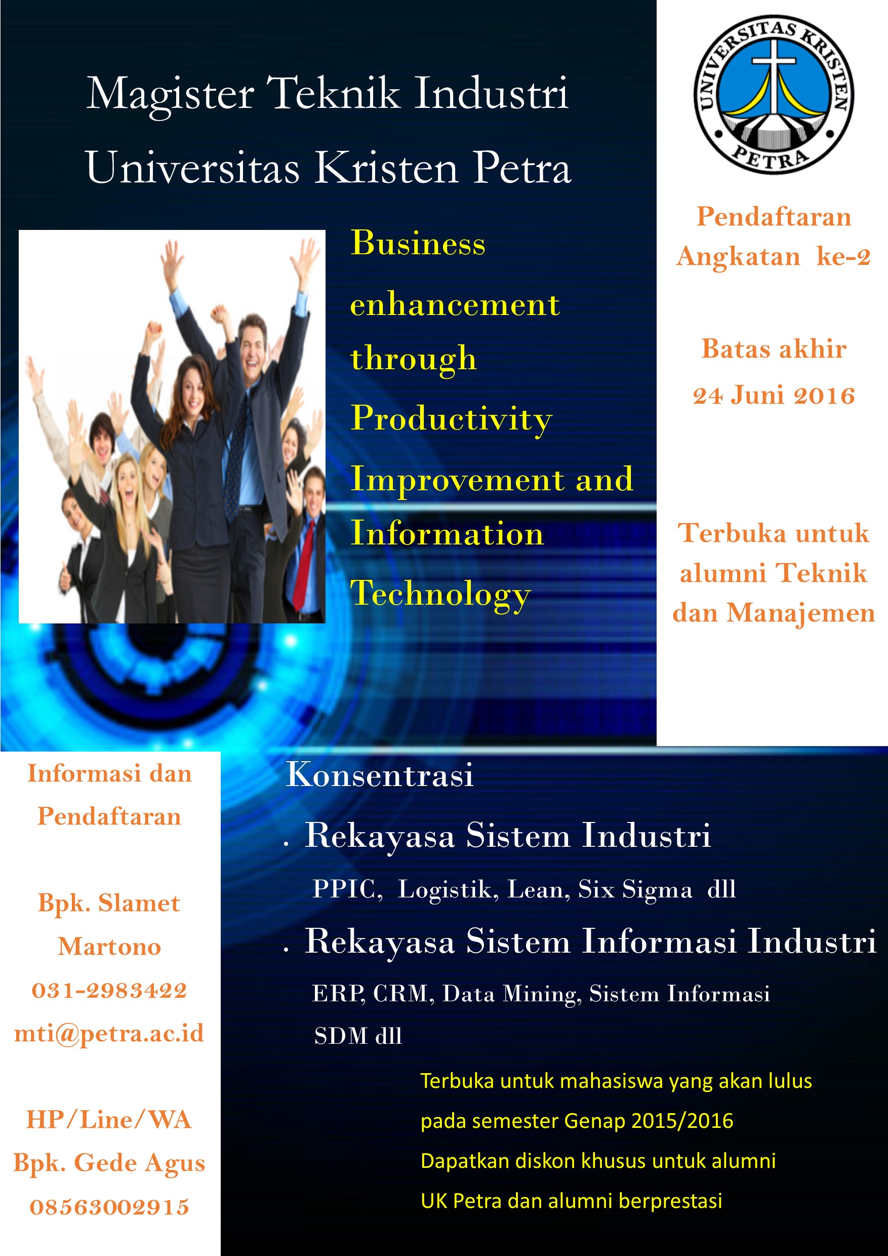 Magister Teknik Industri UK Petra membuka pendaftaran mahasiswa baru gelombang ke-1 angkatan ke-2 dengan konsentrasi studi rekayasa sistem industri dan rekayasa sistem informasi industri. Batas akhir pendaftaran 24 Juni 2016.