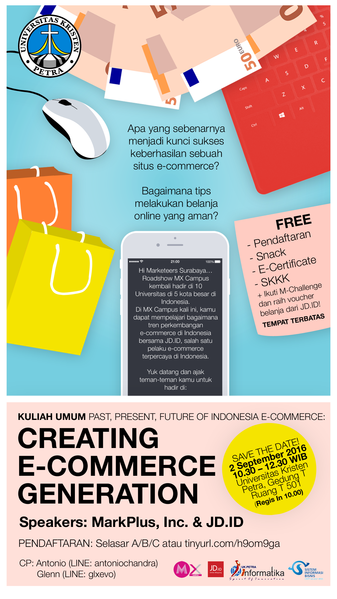 Program Studi Teknik Informatika Universitas kristen Petra Surabaya mengadakan acara kuliah umum past, present future of Indonesia e-commerce dengan tema "Creating E-Commerce Generation". Dengan pembicara dari pihak MarkPlus, Inc. & JD.ID. Acara ini diselenggarakan pada 02 September 2016 di Gedung AV.T 501.