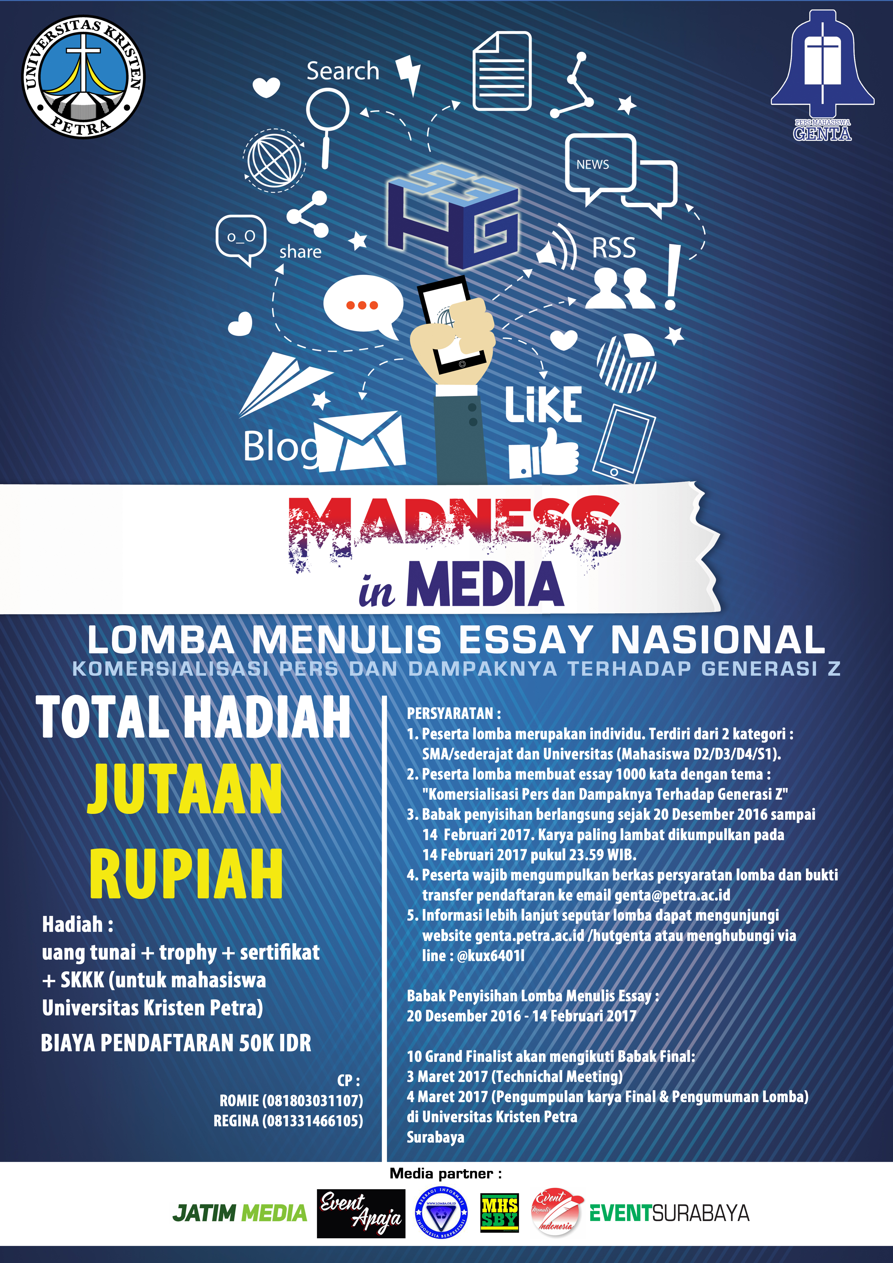 Pers Mahasiswa UK Petra mengadakan lomba menulis essay tingkat nasional dengan tema "Komersialisasi pers dan dampaknya terhadap generasi Z". Untuk grand final pada lomba ini diadakan pada 3-4 Maret 2017 di Kampus UK Petra.