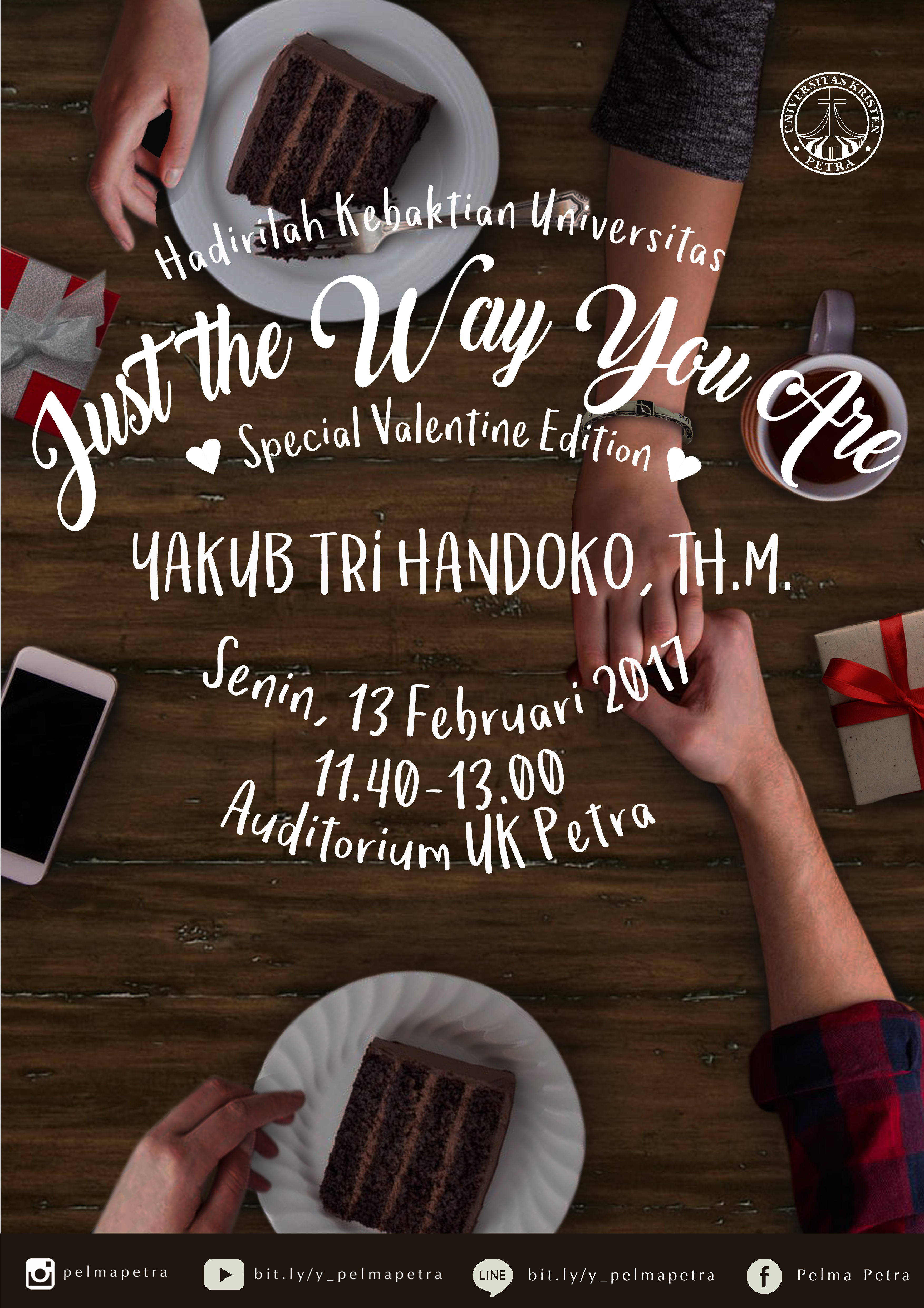 Pusat Kerohanian UK Petra mengajak civitas untuk menghadiri kebaktian Universitas yang dilaksanakan pada tanggal 13 Februari 2017, bertempat di Auditorium UK Petra dengan menghadirkan Bapak Yakub Tri Handoko T.Hm. sebagai pembicara. Tema pada kebaktian ini adalah "Just The way you are"