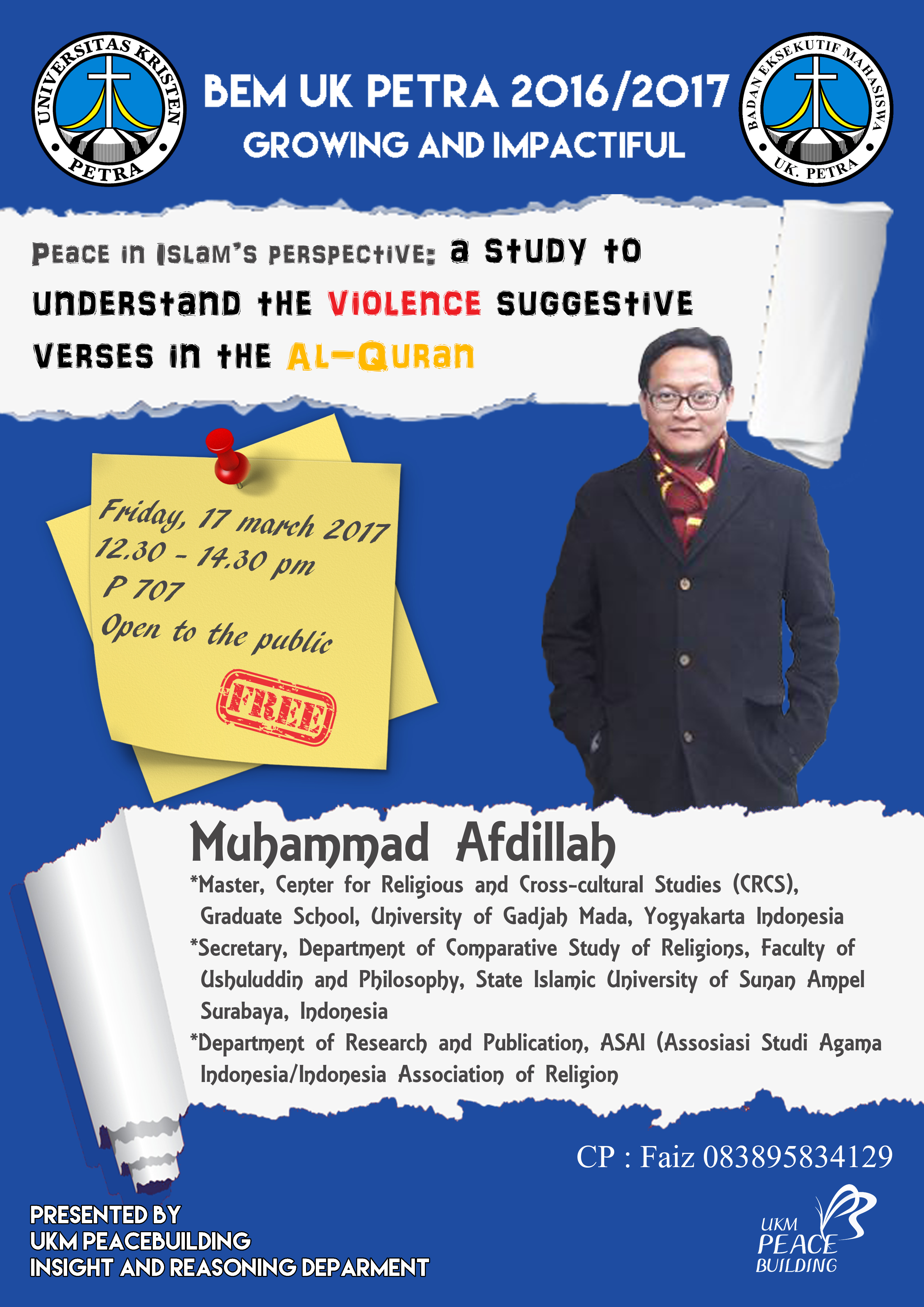 UKM Peace Building Universitas Kristen Petra Surabaya mengadakan dialog lintas agama dengan tema Peace in Islam's perspective: a study to understand the violence suggestive verses in the al-quran dengan narasumber Muhammad Afdillah. Acara ini dilaksanakan pada 17 Maret 2017 di gedung P.707.