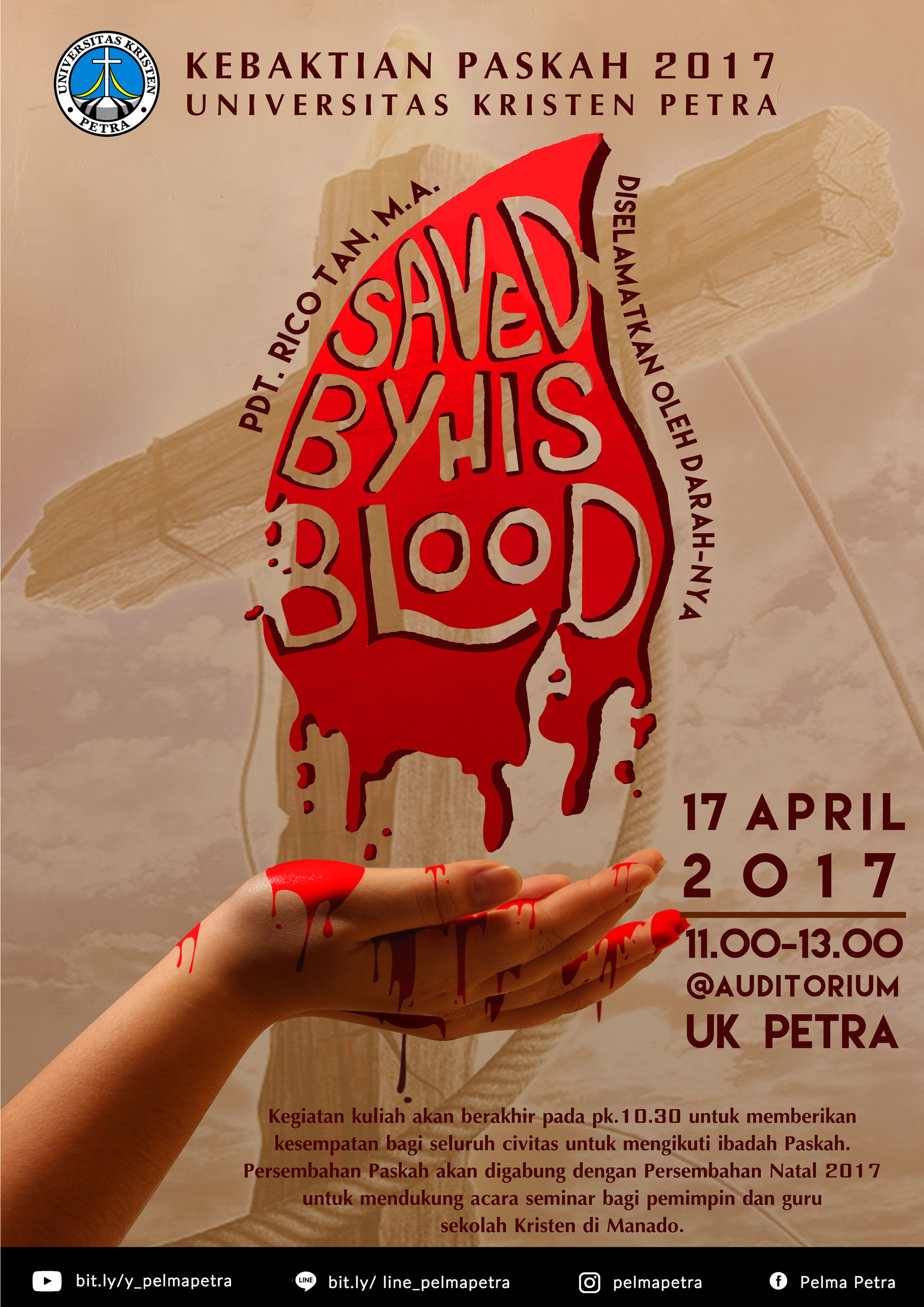Universitas Kristen Petra mengadakan kebaktian paskah universitas, dengan mengangkat tema "Saved by his blood: diselamatkan oleh darah-Nya". Dengan pengkhotbah Pdt. Rico Tan, M.A. Kebaktian ini berlangsung pada : 17 April 2017 di Auditorium UK Petra Surabaya.