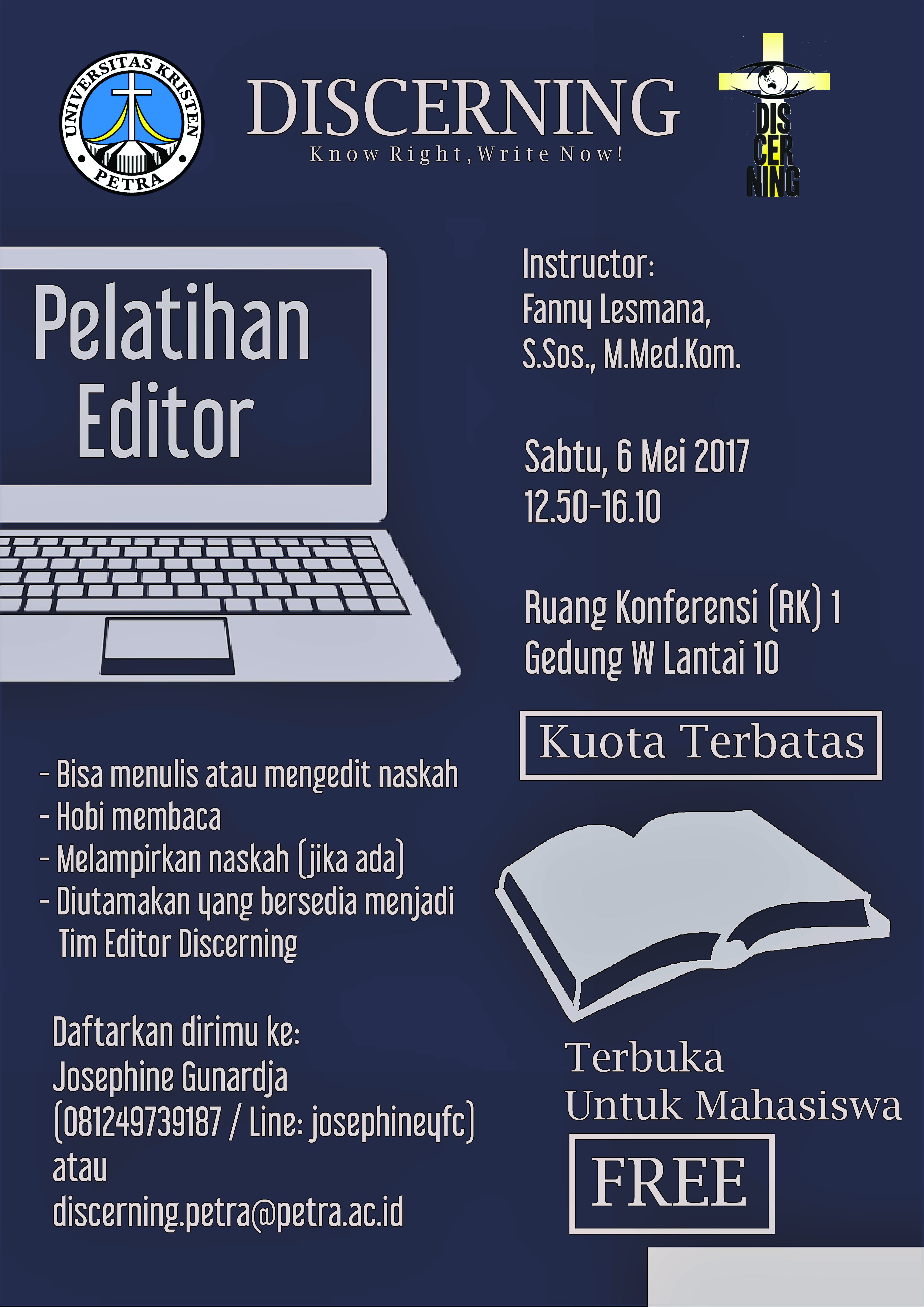 Jurnal Discerning yang dikelola oleh MKDU UK Petra Surabaya, mengadakan pelatihan bagi mahasiswa yang ingin jadi editor. Pelatihan ini diadakan pada 06 Mei 2017, bertempat di RK I gedung Radius Prawiro. Dengan mendatangkan Fanny Lesmana sebagai instruktur.