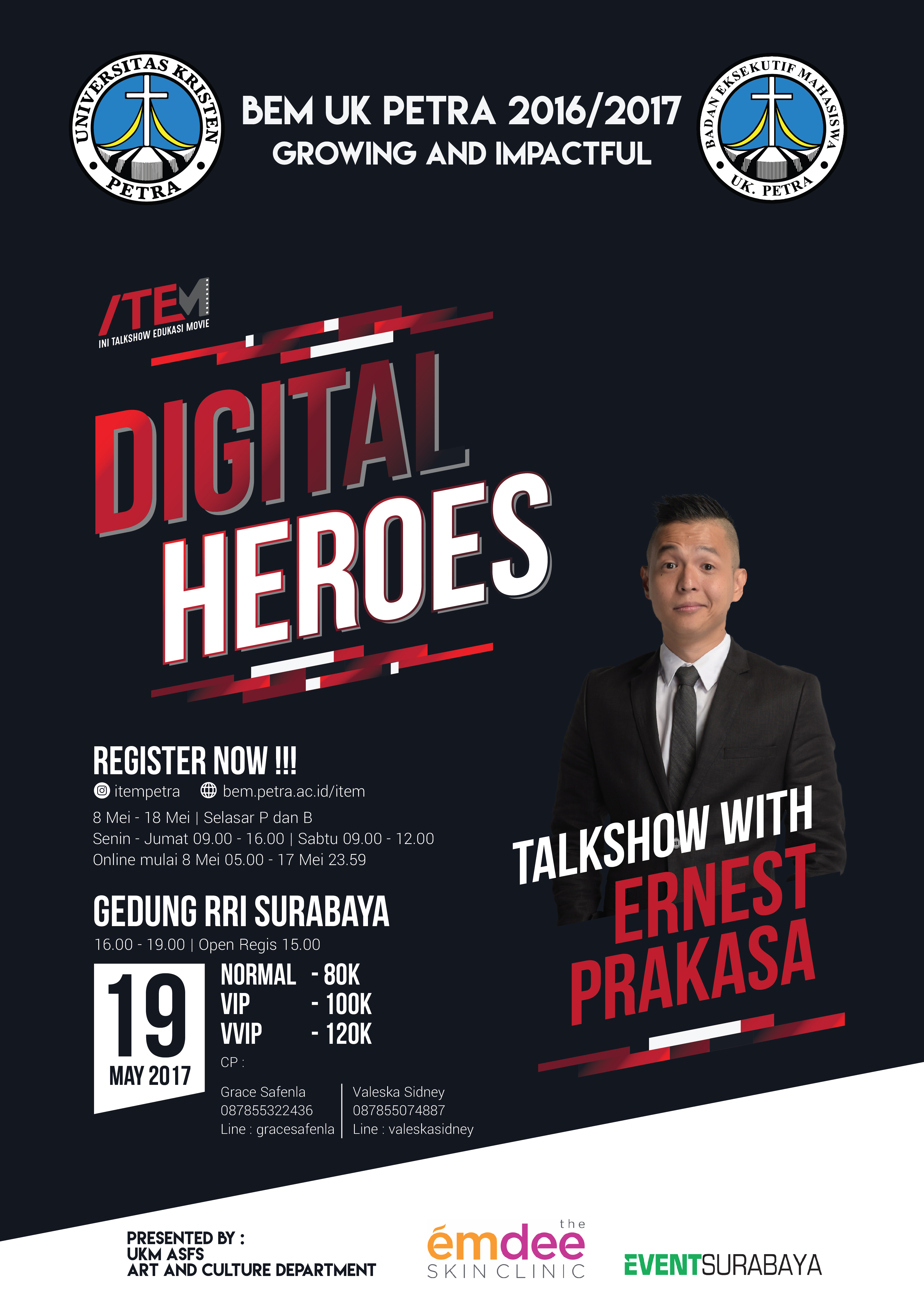 UKM ASFS Universitas Kristen Petra Surabaya mengadakan acara talkshow dengan narasumber Ernest Prakasa. Acara ini mengangkat tema "digital heroes". Dilaksanakan pada 19 Mei 2017 di gedung RRI Surabaya.