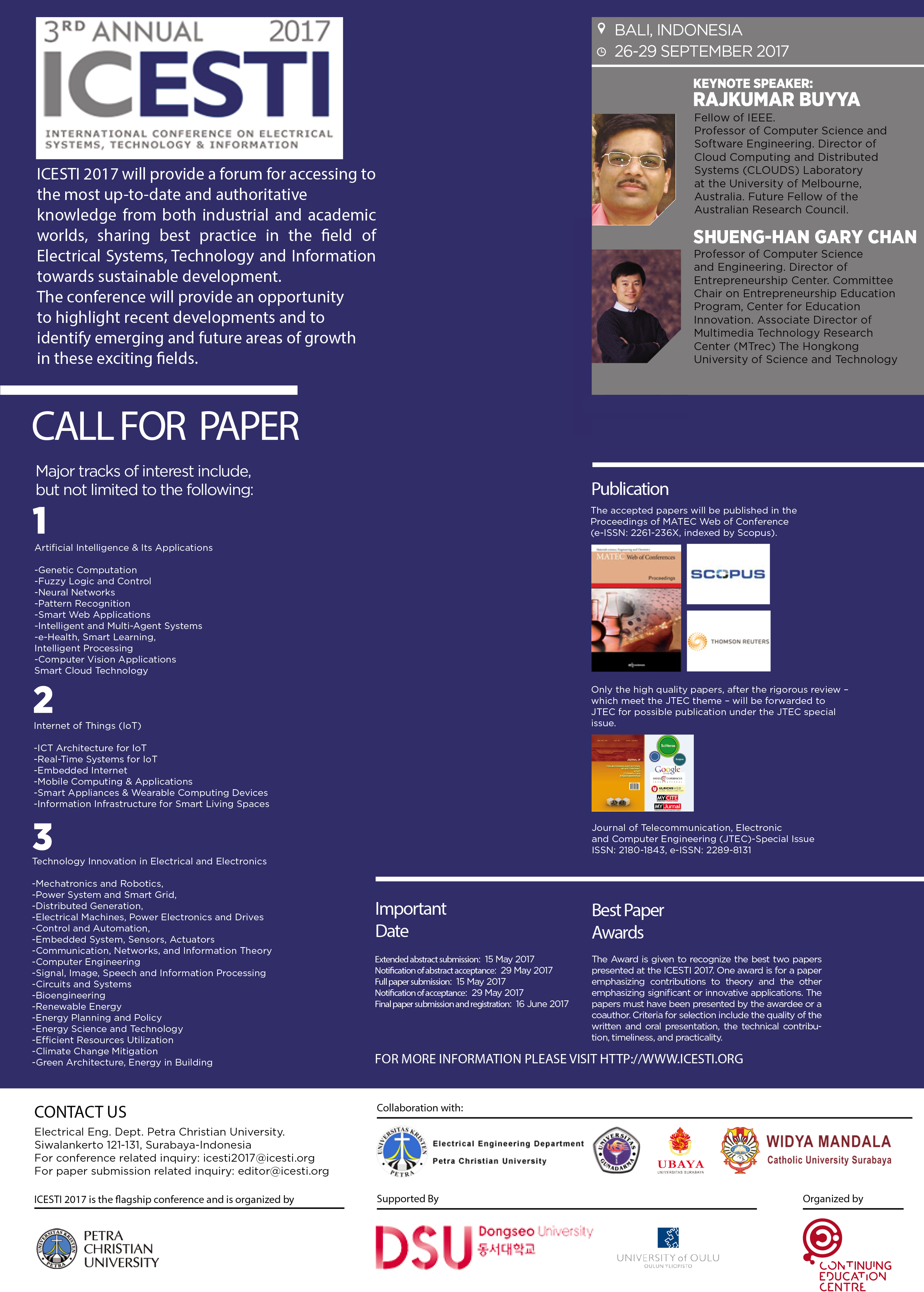 Teknik Elektro Universitas Kristen Petra Surabaya menjadi tuan rumah untuk penyelenggaraan ICESTI (International Conference on Electrical Systems Technology Information) 3rd 2017. Acara ini digelar pada 26-29 September 2017 di Bali. Dengan mengundang Rajkumar Buyya dan Shueng-Han Gary Chan sebagai keynote speaker.