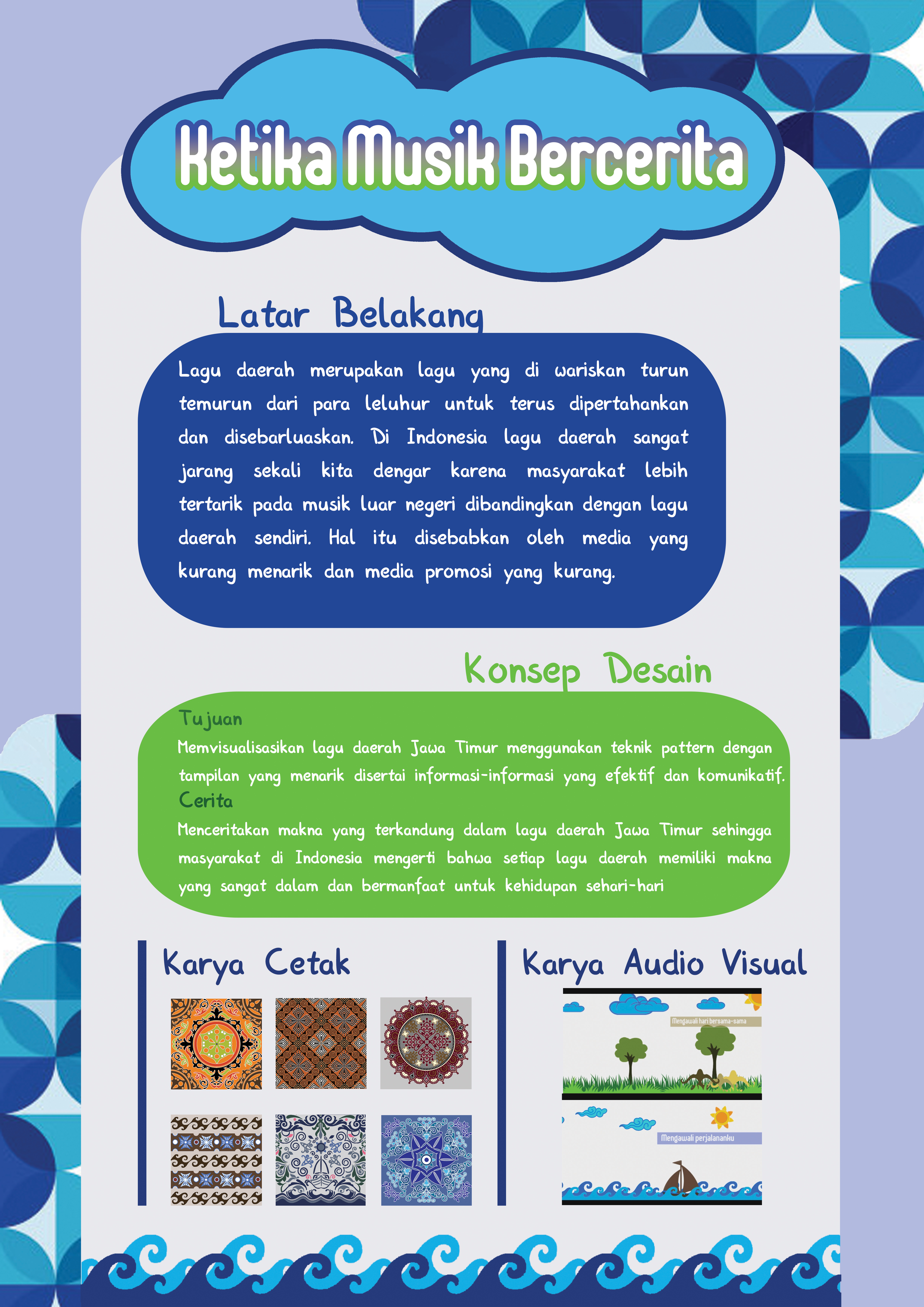 Indonesia merupakan negara yang kaya akan budaya dan sumber daya alam, akan tetapi kesadaran masyarakat itu sendiri masih kurang untuk mengolah kekayaan tersebut karena berbagai faktor, salah satunya karena persaingan yang cukup ketat dengan produk budaya luar negeri.Teknik pattern merupakan hal yang sudah tidak terlalu asing lagi bagi masyarakat di Indonesia, teknik ini lebih sering dikenal dengan sebutan batik. Perancangan audio visual sebagai visualisasi lagu daerah Jawa Timur merupakan proyek yang menitik beratkan pada penggabungan antara video musik dengan teknik pattern yang terbilang masih baru. Maka dari itu di pilihlah lagu “Cublak-Cublak Suweng” dan “Tanduk Majeng” dari daerah Jawa Timur karena kedua lagu tersebut cukup dikenali dan menarik perhatian. Sesuai dengan makna yang terkandung dalam kedua lagu tersebut maka konsep perancangannya mengacu pada hal-hal yang bernuansa kehidupan di daerah Jawa Timur.