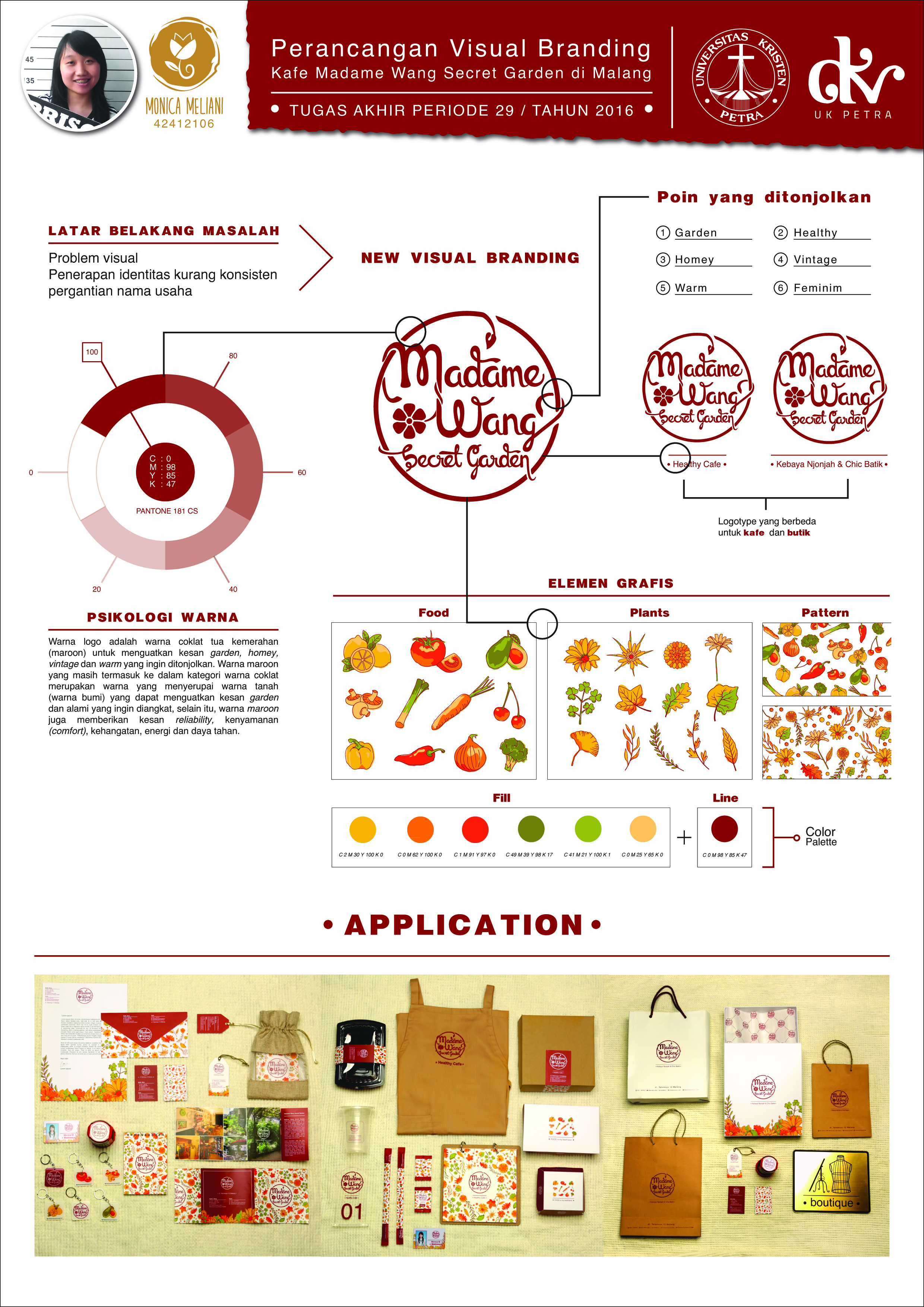 Madame Wang Secret Garden adalah sebuah kafe di Kota Malang yang memiliki konsep healthy garden cafe & batik. Visual branding yang dimiliki oleh Madame Wang Secret Garden Kafe saat ini masih kurang dapat mewakili brand image yang ingin ditampilkan oleh perusahaan serta kurang memiliki konsistensi dalam penerapan identitasnya, sehingga brand image yang tersampaikan bisa berbeda-beda. Melalui perancangan visual branding ini, diharapkan akan tercipta sebuah identitas visual baru yang lebih tepat dan sesuai untuk menampilkan citra perusahaan yang dimiliki oleh Madame Wang Secret Garden Kafe.