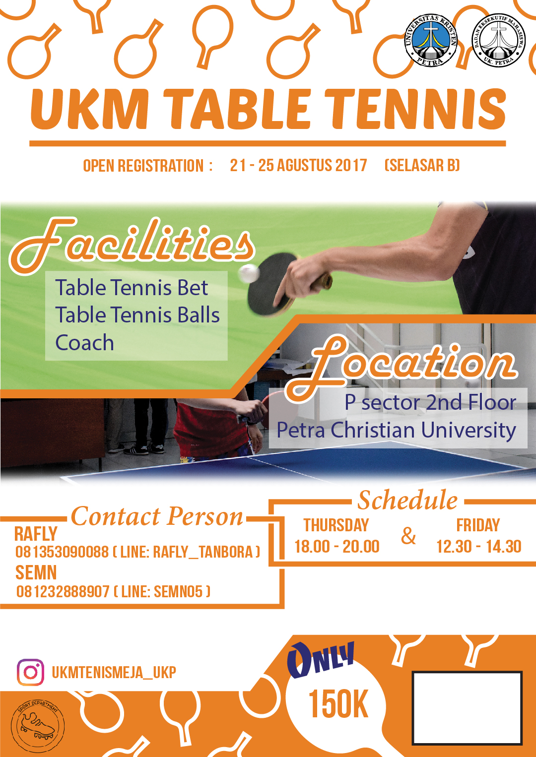 UKM tenis meja Universitas Kristen Petra Surabaya membuka pendaftaran bagi mahasiswa baru UK Petra. Pendaftaran dibuka pada tanggal 21-25 Agustus 2017, di selasar gedung B.