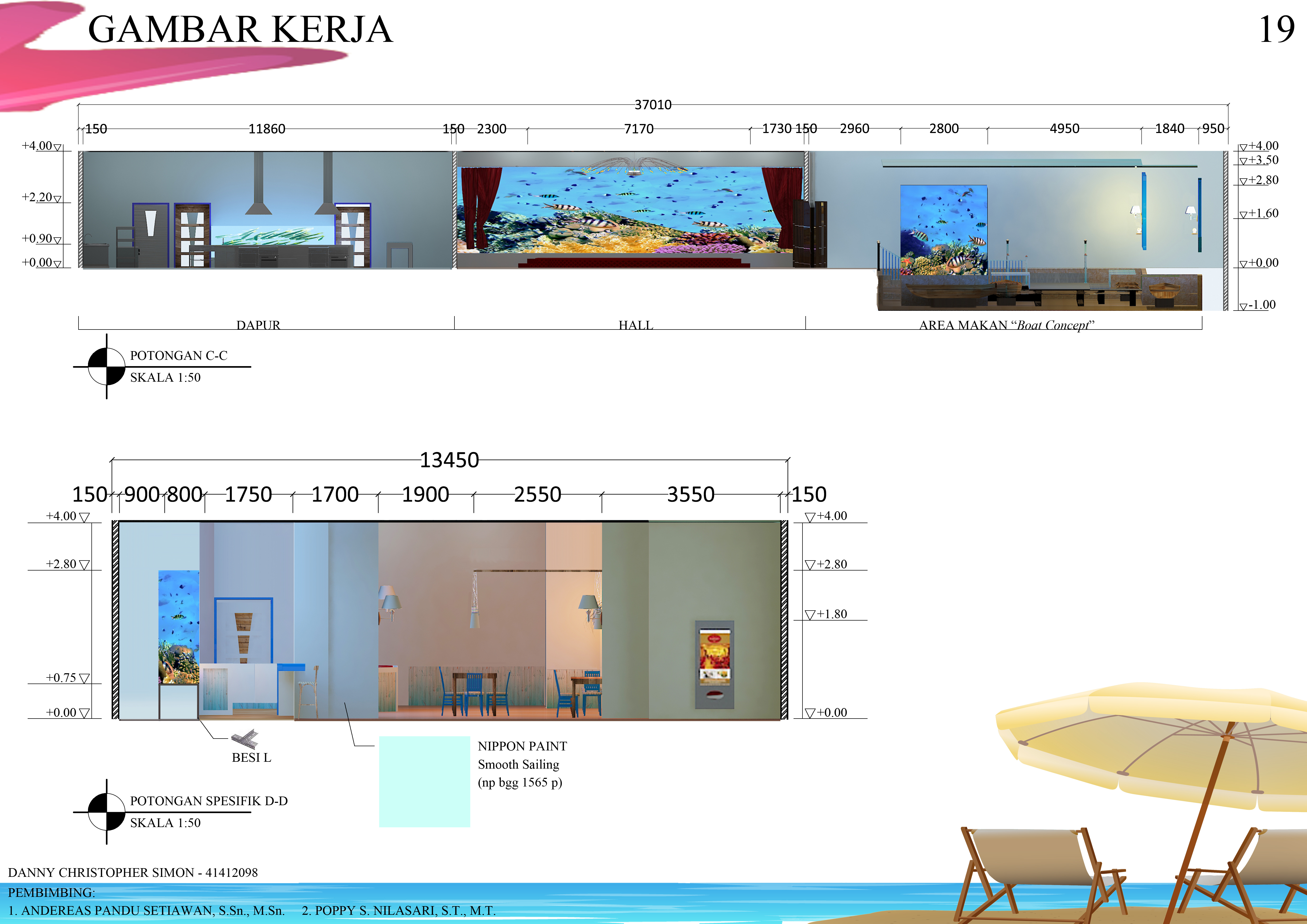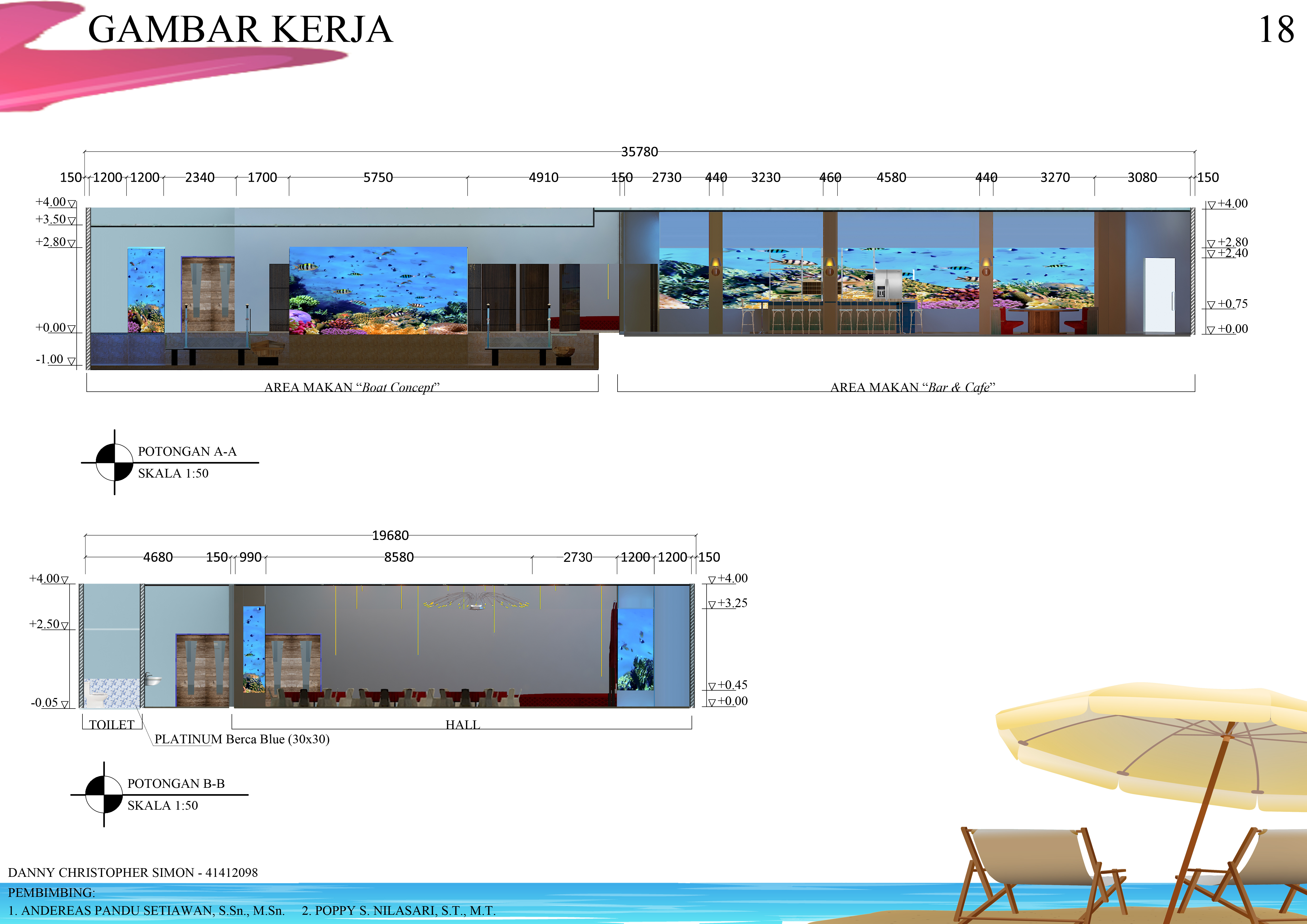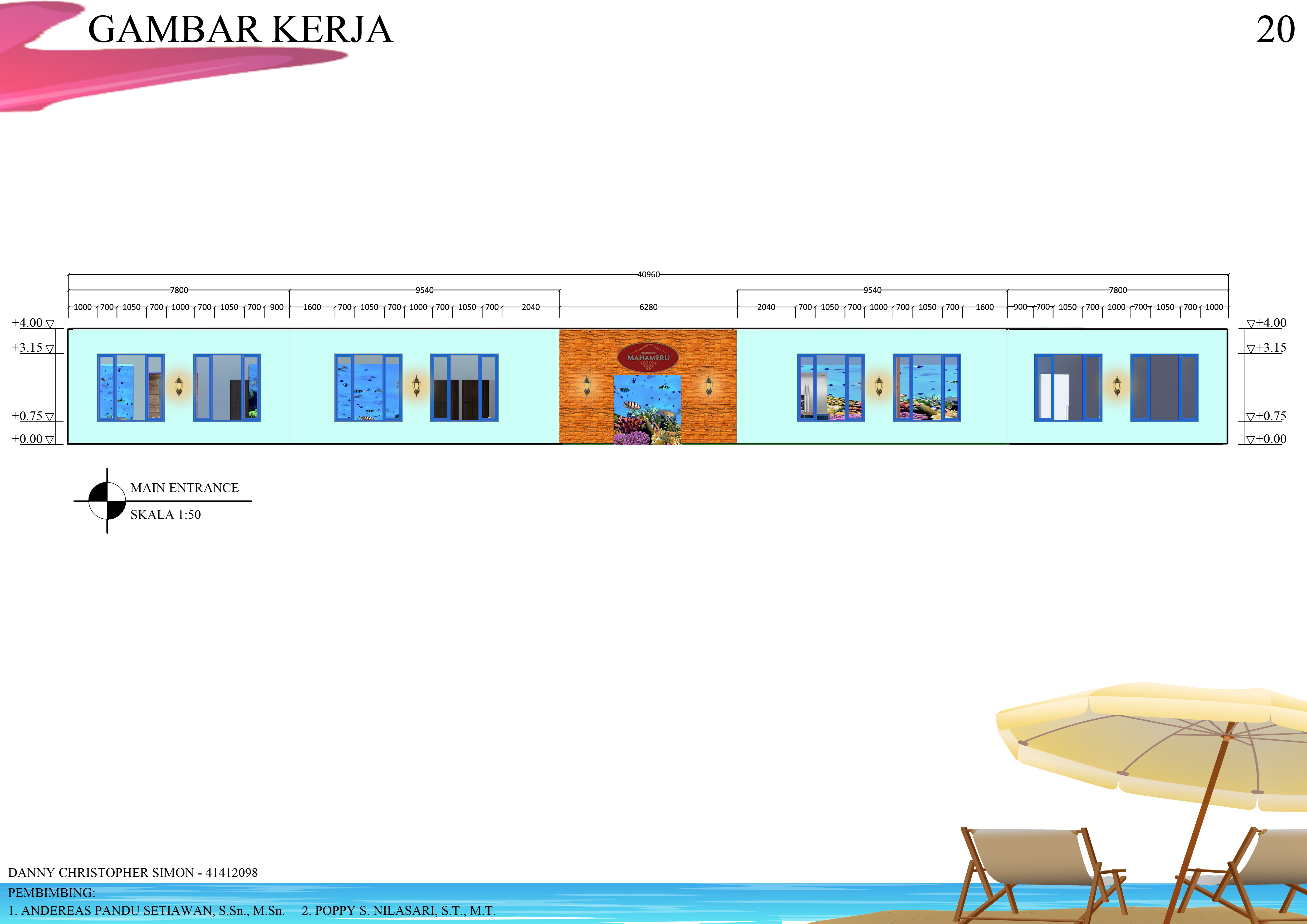 Makan adalah kebutuhan utama manusia, karena itu cukup banyak restoran yang dibangun di Surabaya, salah satunya restoran Mahameru. Restoran ini akan mengangkat kekayaan dan keindahahan laut Indonesia yang akan diterapkan pada interior dalam bentuk akuarium, dan dilengkapi dengan informasi jenis, populasi dan habitat ikan-ikan Indonesia. Restoran ini memiliki konsep yang terinspirasi dari laut dan gunung (logo Mahameru), sehingga menciptakan nama ”water eruption” yang akan memiliki bentuk dan warna seperti gunung dan biru, yang akan diaplikasikan pada lantai, dinding, dan plafon interior restoran Mahameru. Gaya desain yang akan digunakan adalah coastal style yang memiliki suasana hangatnya pantai yang didominasi warna biru dan material kayu alami, sehingga mendukung konsep yang telah terbentuk dan lebih memberikan suasana yang tematik pada interior Mahameru.