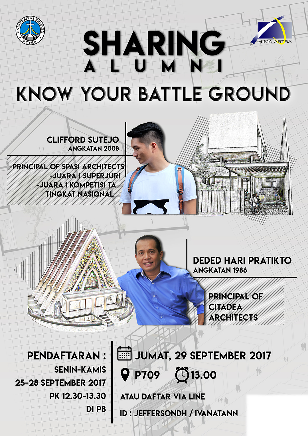 Program teknik Arsitektur Uk Petra mengadakan acara, sharing alumni: know your battle ground. Acara ini dilaksanakan pada Jumat, 29 September 2017, di ruang P.709 Jam 13.00 WIB. Menghadirkan Clifford Sutejo alumni angkatan 2008 dan Dede Hari Pratikto alumni angkatan 1986 sebagai nara sumber.