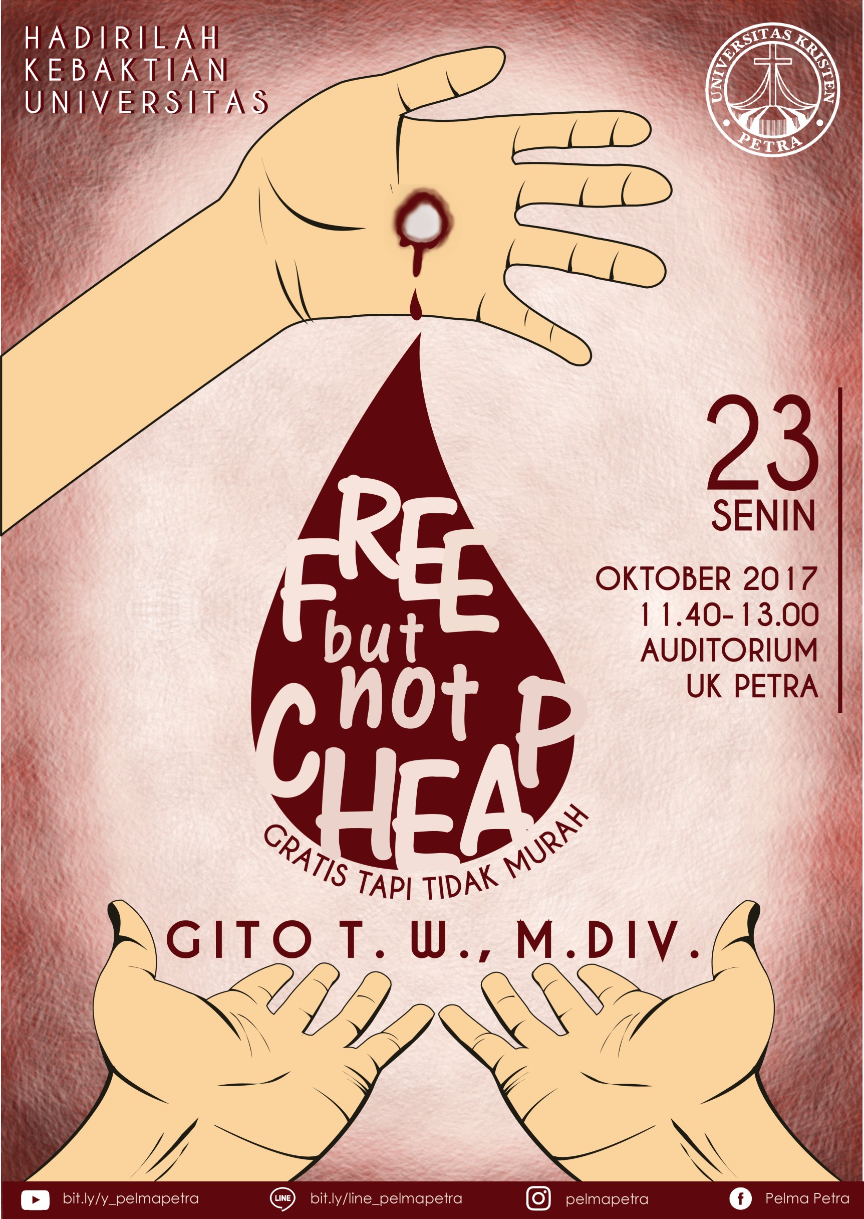 Pusat Kerohanian UK Petra mengundang civitas akademika untuk hadir dalam acara kebaktian universitas yang diadakan setiap Senin. Pada tanggal 23 Oktober 2017, dengan mengangkat tema "free but not cheap (gratis tapi tidak murah)" kebaktian ini dihadiri pengkhotbah Bapak Gito T. W.