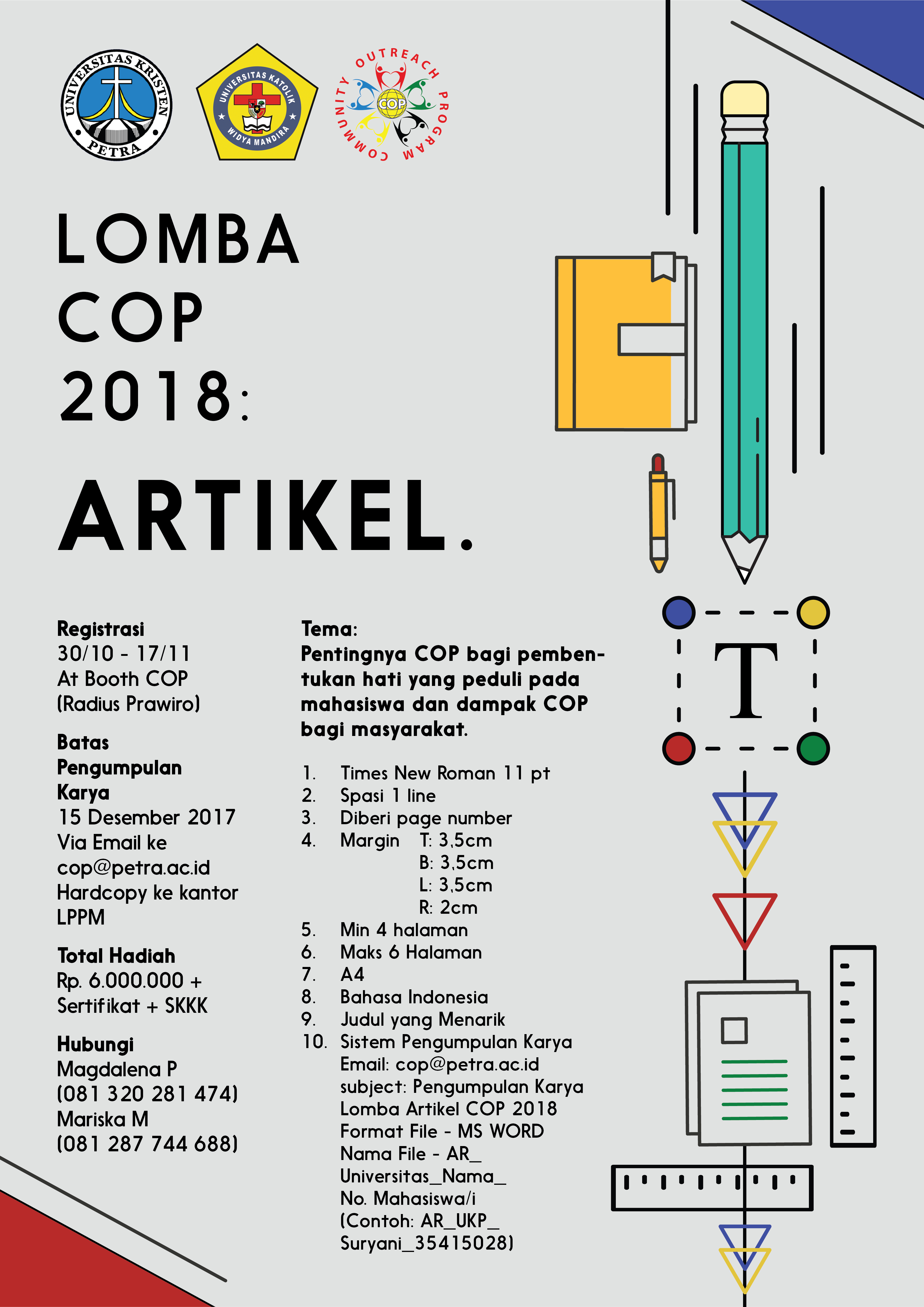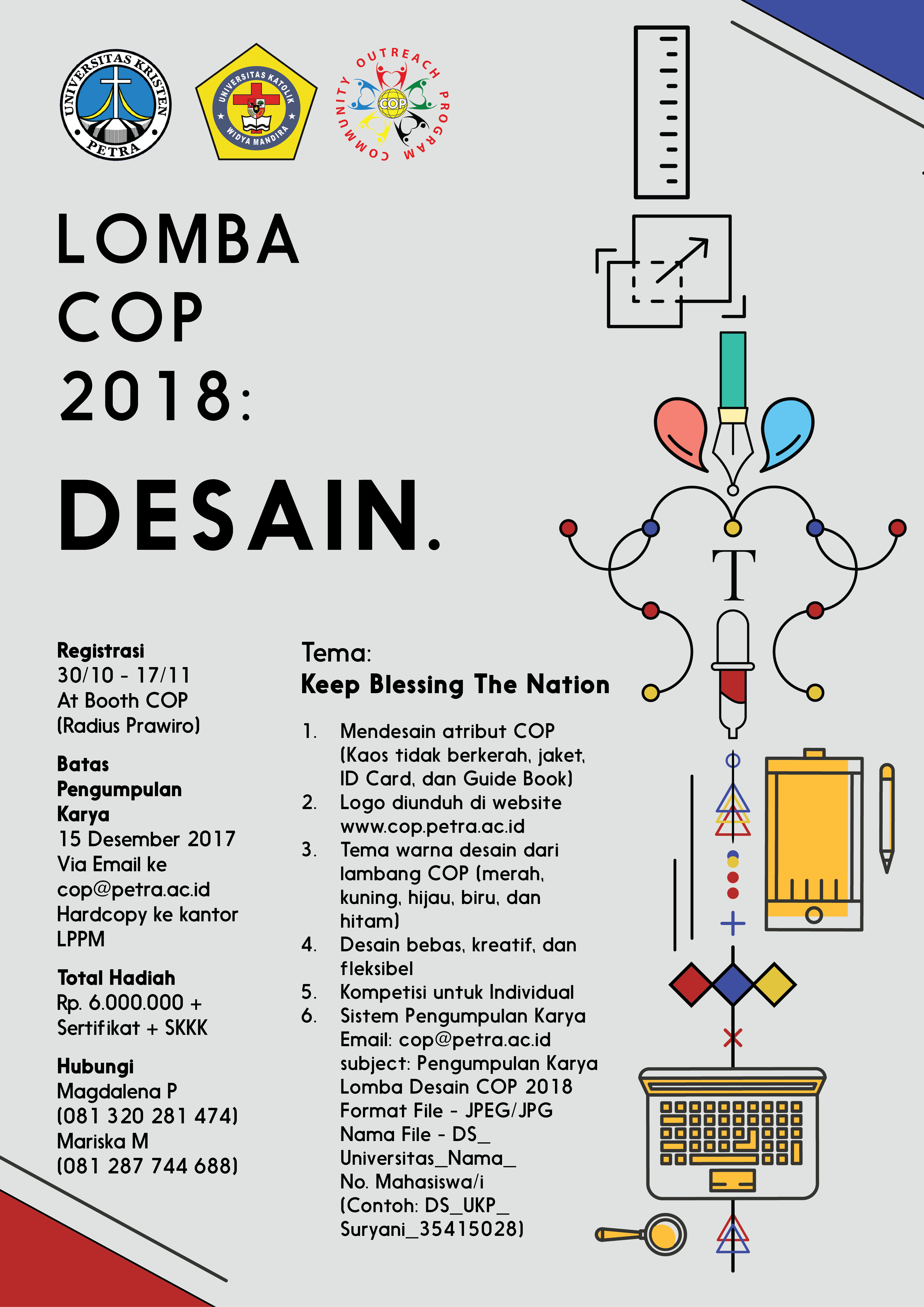 Lembaga Penelitian dan Pengabdian kepada Masyarakat Universitas Kristen Petra Surabaya, mengadakan lomba tentang Community Outreach Program 2018. Ada 2 kriteria dalam lomba yaitu ARTIKEL yang bertemakan pentingnya COP bagi pembentukan hati yang peduli mahasiswa dan dampak COP bagi masyarakat, dan DESAIN yang bertemakan keep blessing the nation. Pendaftaran untuk lomba ini dibuka pada tanggal 30 Oktober 2017 hingga 17 November 2017. Batas pengumpulan karya pada tanggal 15 Desember 2017.
