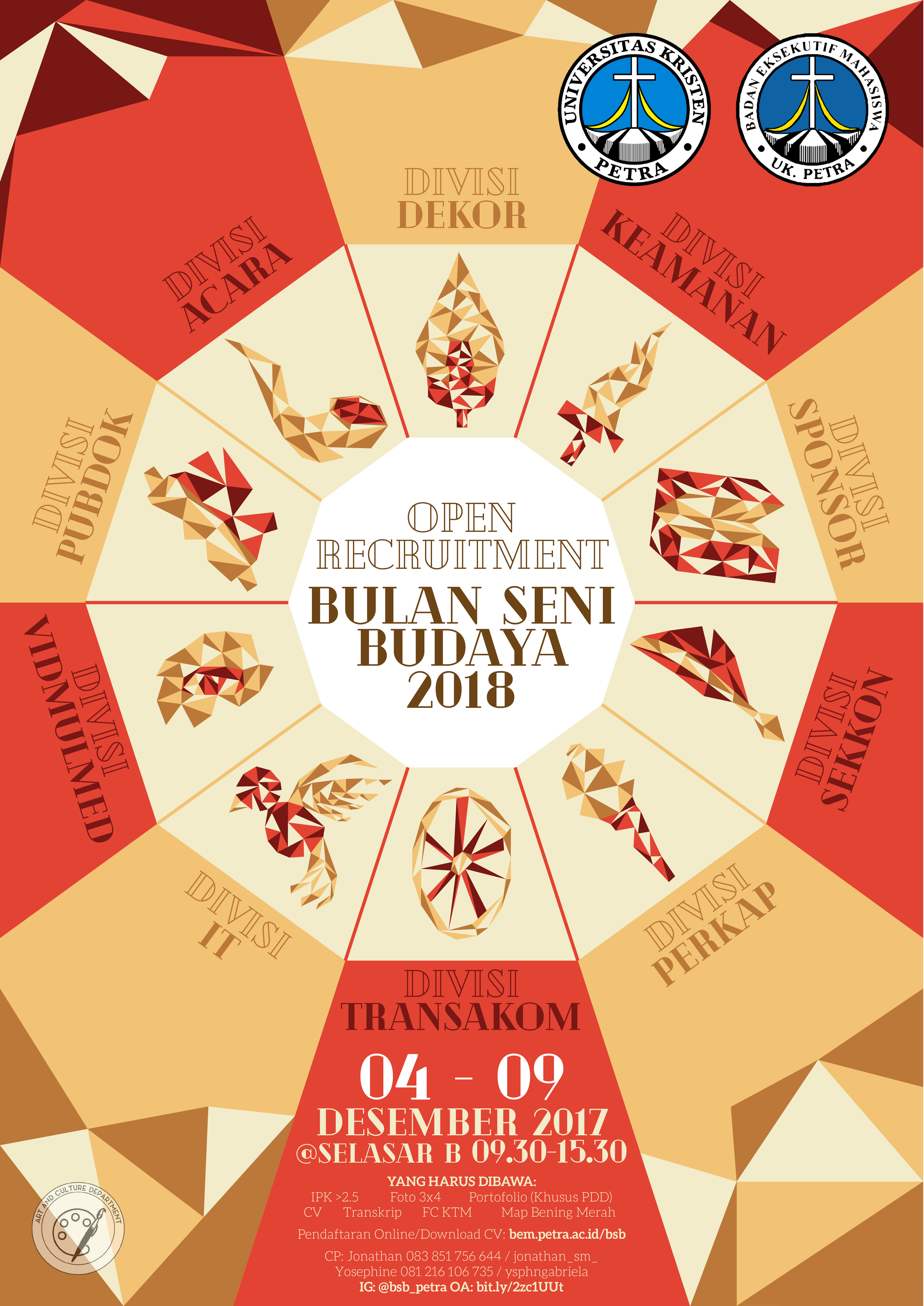 Didalam mempersiapkan acara Bulan Seni Budaya (BSD) 2018, Badan Eksekutif Mahasiswa UK Petra membuka kesempatan bagi mahasiswa UK Petra, untuk bergabung dalam kepanitian tim BSD 2018 ini. Adapun pendaftaran dibuka pada tanggal 04 - 09 Desember 2017 di selasar gedung B.