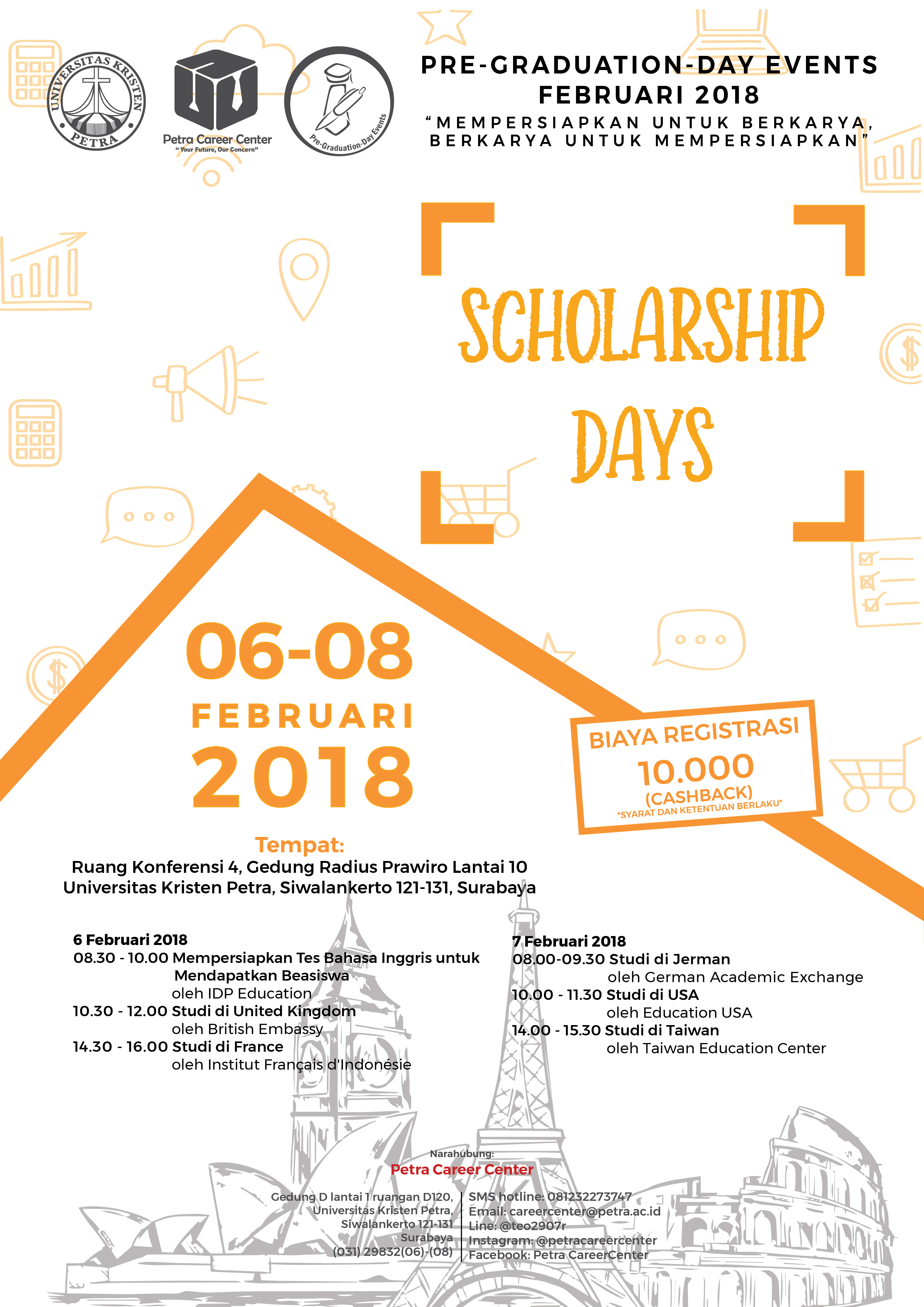 Scholarship days diadakan oleh Pusat Karir Universitas Kristen Petra Surabaya, acara ini diadakan pada 06-08 Februari 2018 bertempat di RK IV gedung Radius Prawiron, dengan biaya registrasi sebesar 10.000 rupiah.
