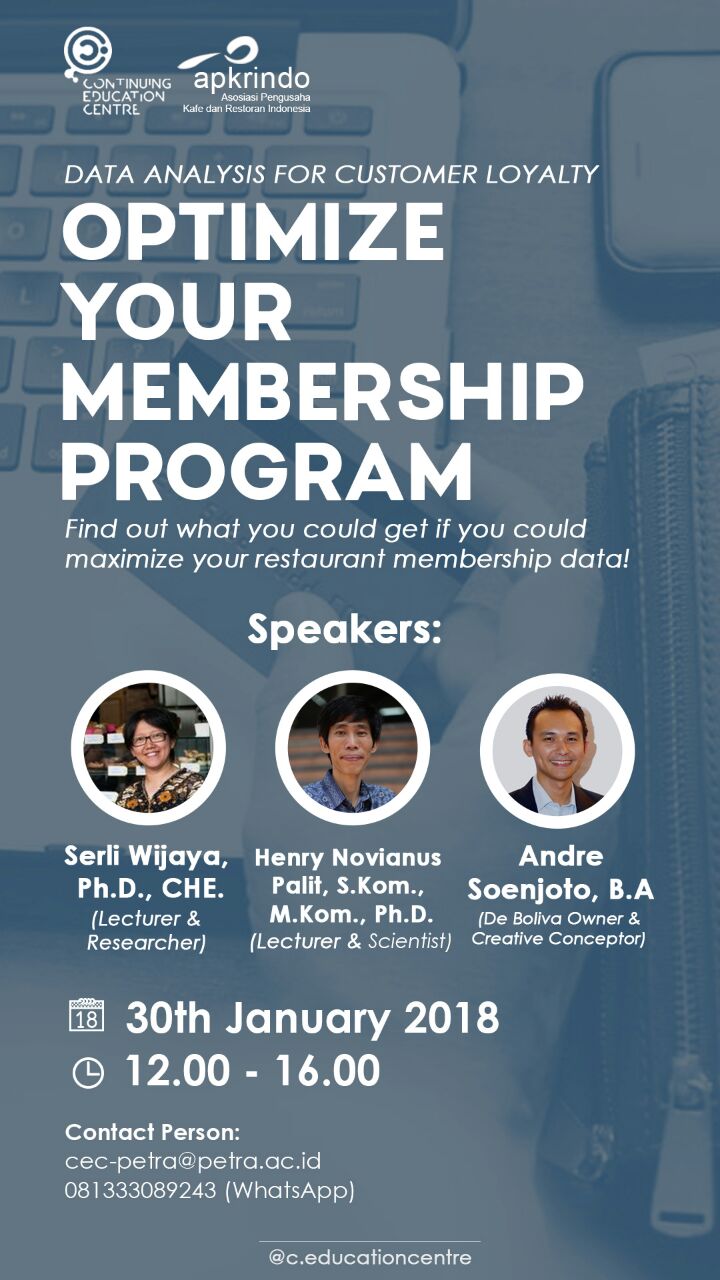 Program Pendidikan Profesional Berkelanjutan UK Petra mengadakan seminar dengan topik "Data analysis for customer loyalty: optimize your membership program". Acara ini diadakan pada 30 Januari 2018 dengan menghadirkan narasumber Sherli Wijaya, Henry Novianus Palit, Andre Soenjoto.