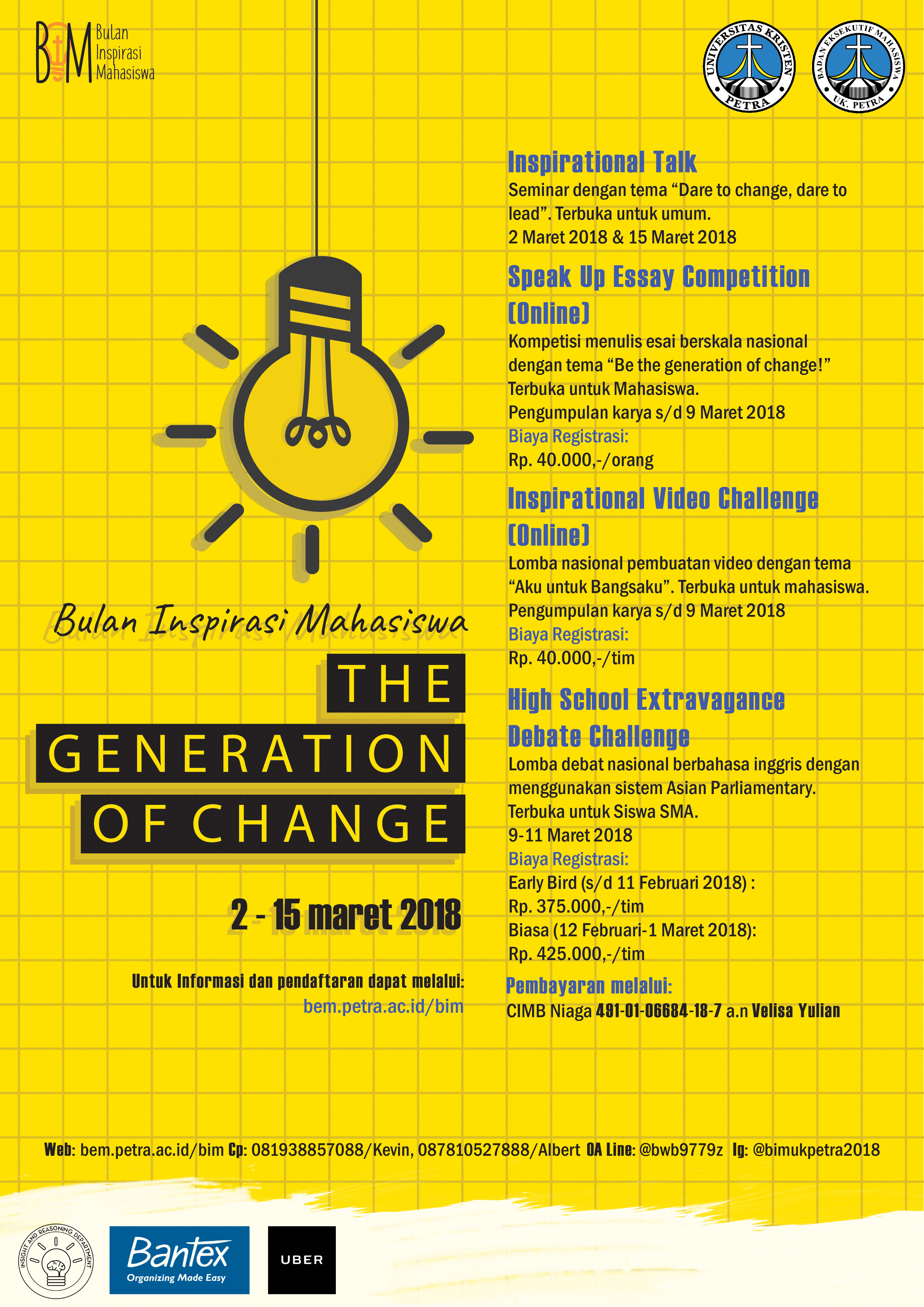 Badan Eksekutif Mahasiswa UK Petra, mengadakan acara yang bernama Bulan Inspirasi Mahasiswa (The Generation of change). Dalam acara ini terdapat beberapa kegiatan yang bisa diikuti peserta, seperti seminar, lomba menulis, lomba membuat video, dan lomba debat. Rangkaian kegiatan ini dilaksanakan pada 2-15 Maret 2018. Untuk informasi dan pendaftaran dilihat di bem.petra.ac.id/bim