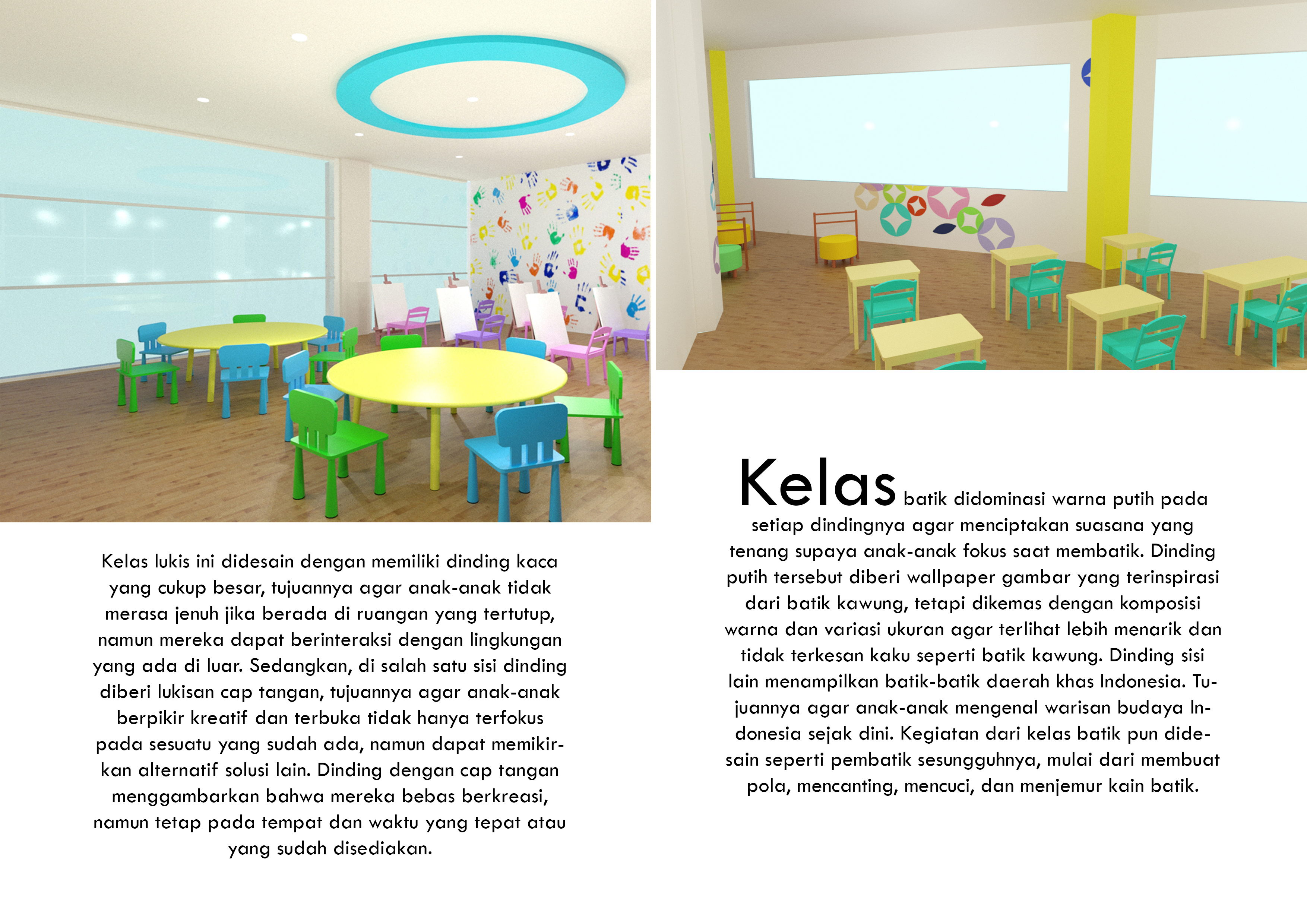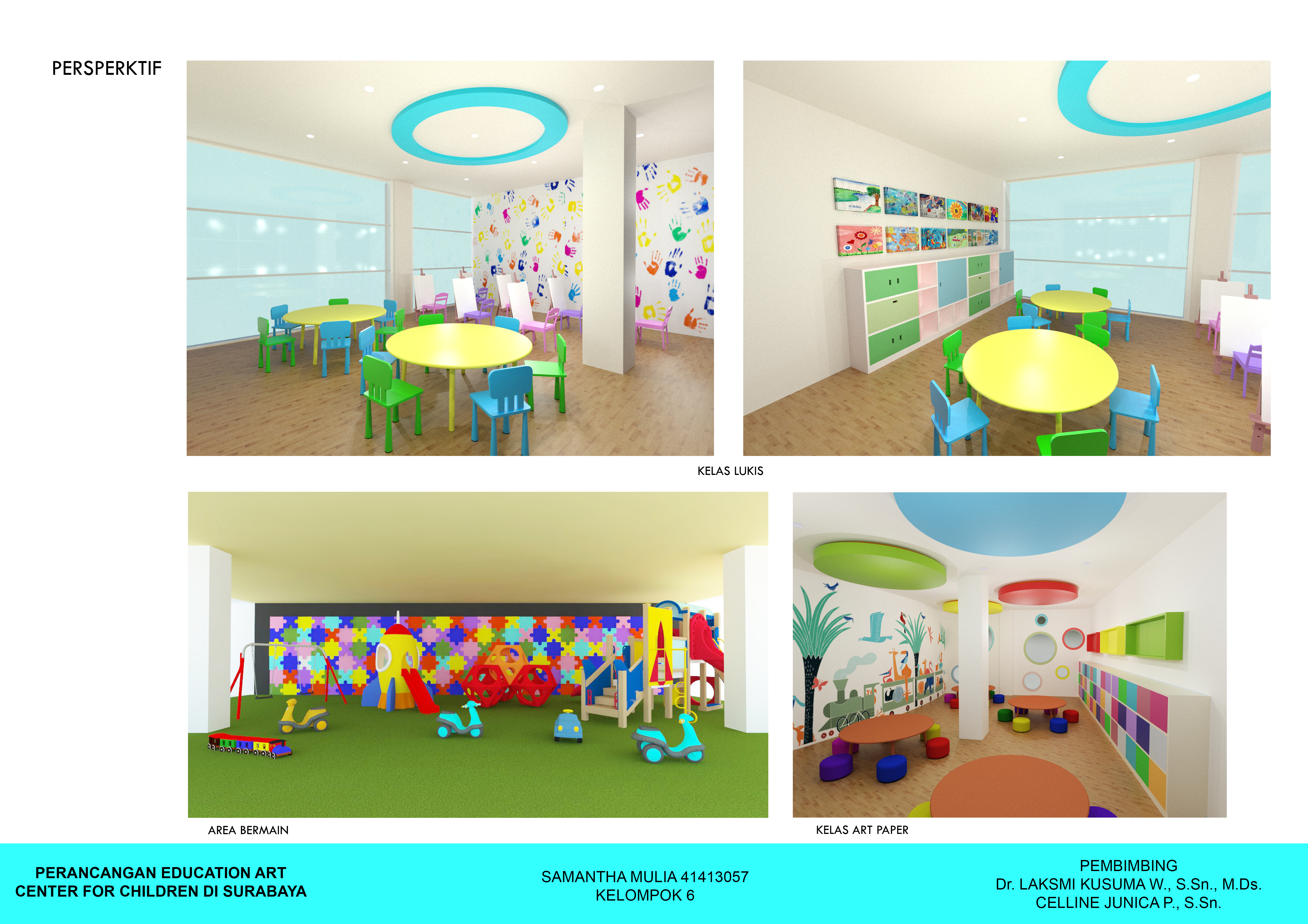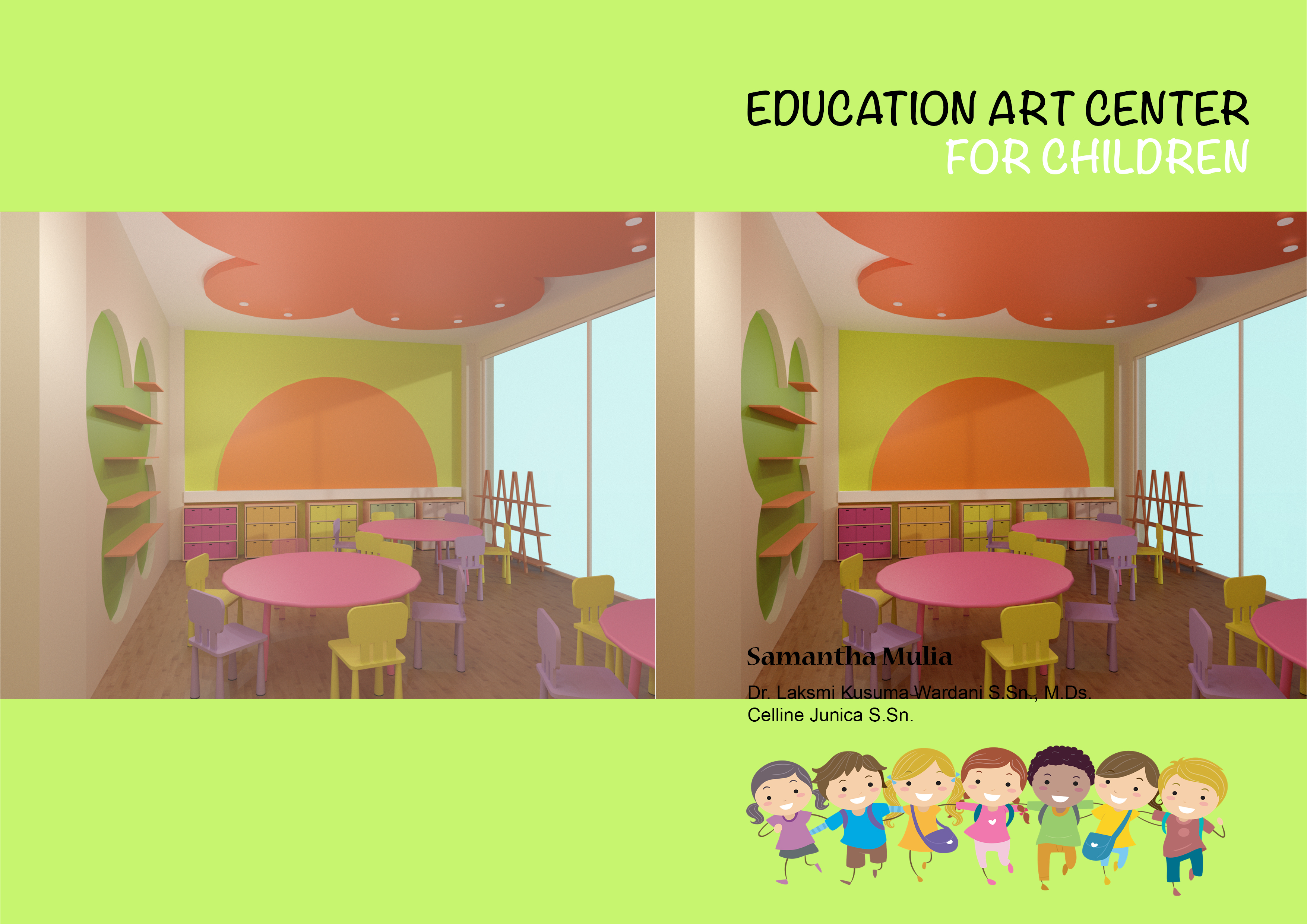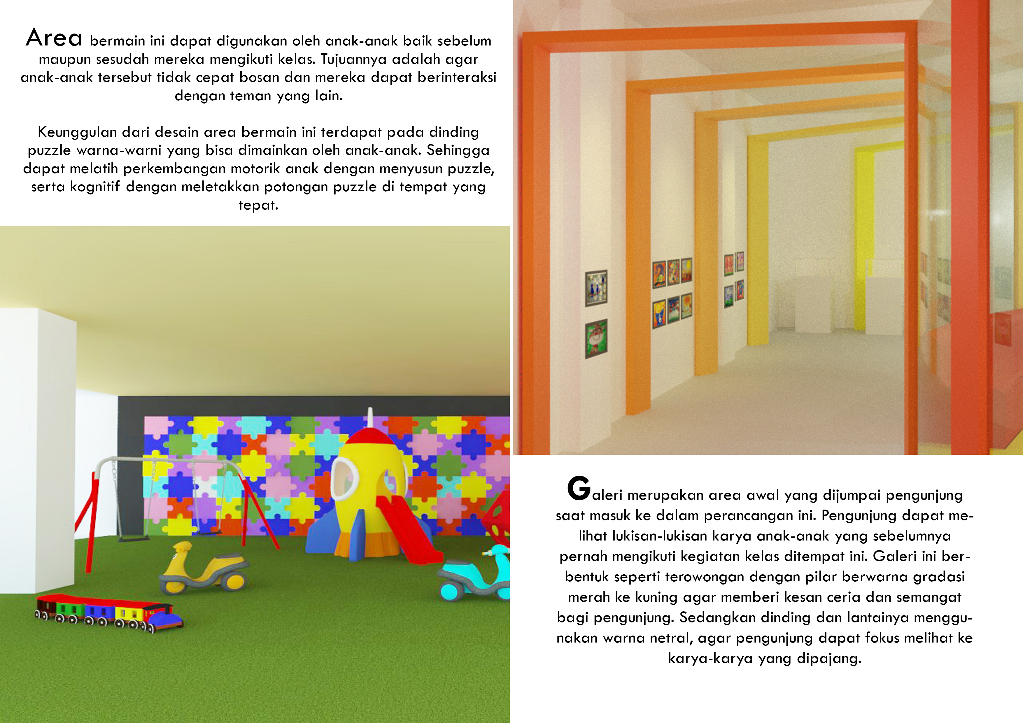 Anak-anak memiliki rasa ingin tahu dan kreativitas yang tinggi. Rasa ingin tahu dan kreativitas tersebut dapat diarahkan ke arah yang positif agar mereka menemukan bakat dan minatnya lebih dini. Kreativitas tersebut dapat disalurkan melalui seni. Perancangan ini menyediakan Pusat Pendidikan Seni bagi anak-anak untuk dapat mencoba hal baru serta meningkatkan kreativitas mereka sejak dini. Perancangan ini berisi fasilitas kelas-kelas seperti kelas lukis, clay, art paper, cake decoration, merangkai bunga, batik, kelas serbaguna dan fasilitas lainnya seperti perpustakaan, kafe, ruang kantor, lobi dan area bermain. Konsep “Eduplay and Fun” menciptakan suasana ruang yang menyenangkan serta menyesuaikan karakteristik masing-masing anak. Konsep diaplikasikan melalui permainan warna, bentuk dan ukuran.