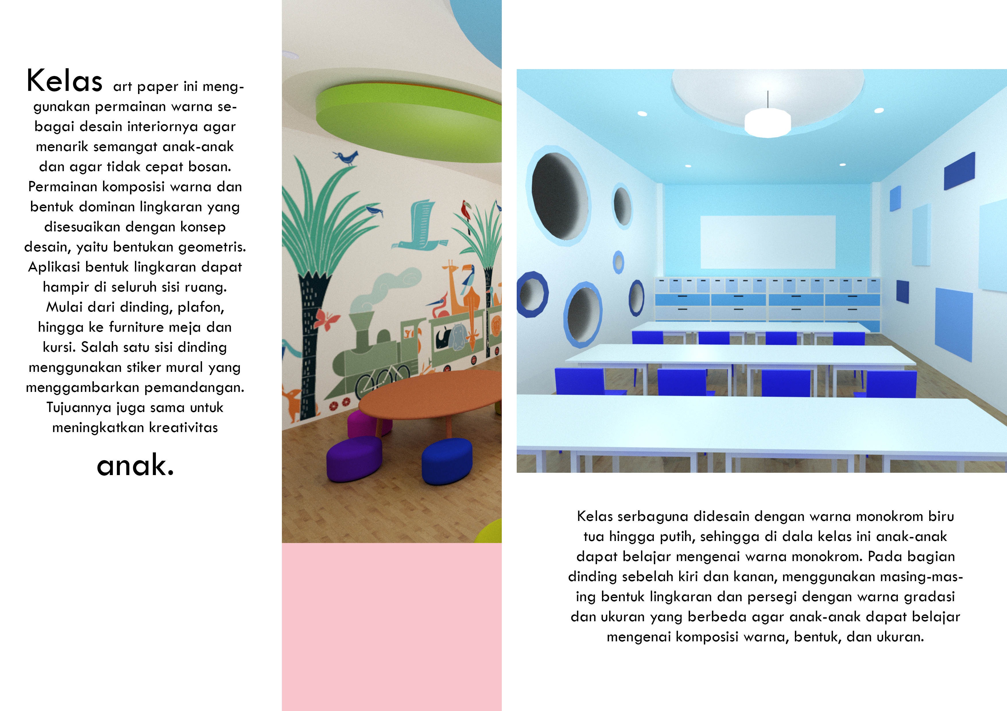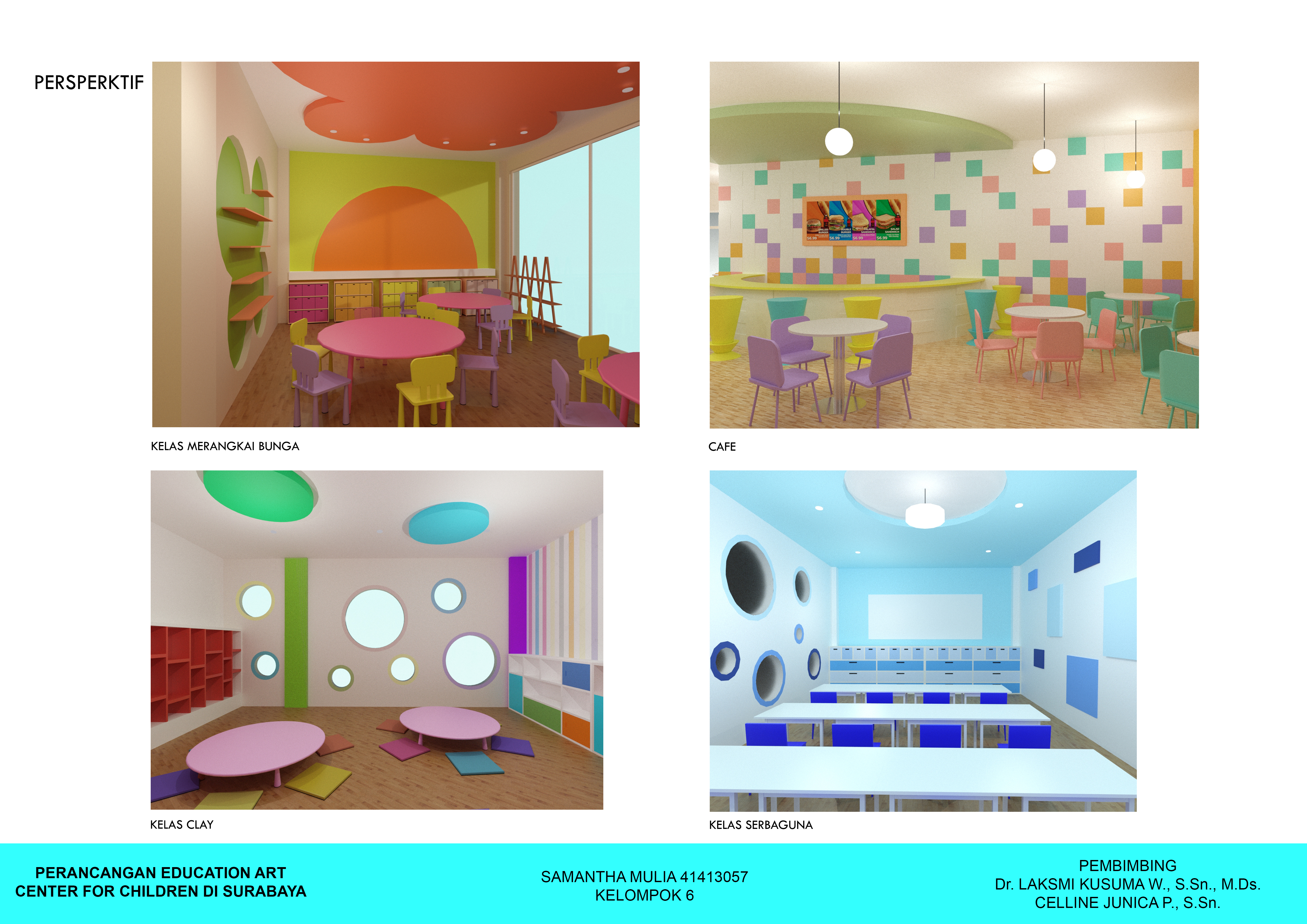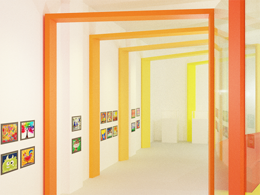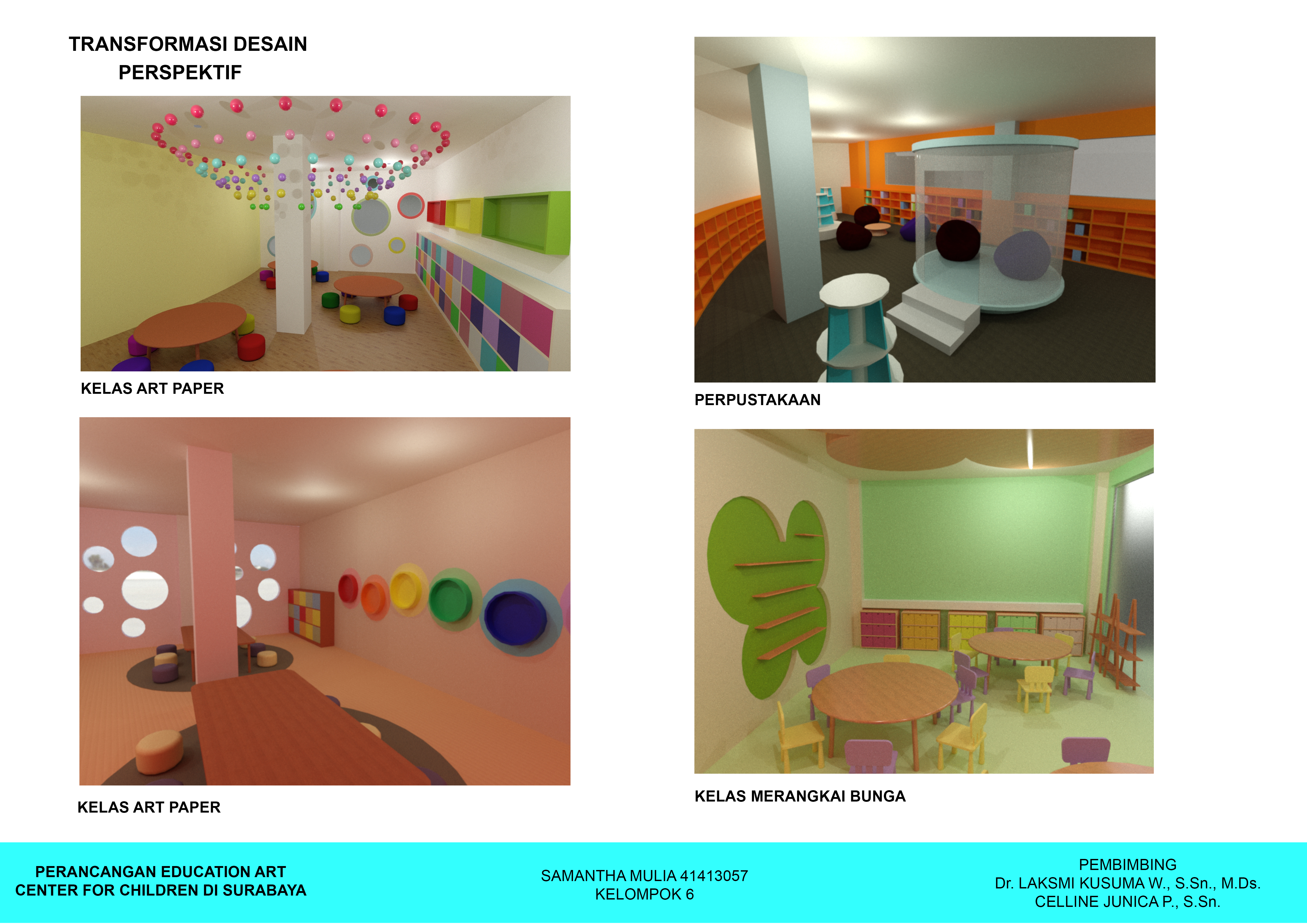 Anak-anak memiliki rasa ingin tahu dan kreativitas yang tinggi. Rasa ingin tahu dan kreativitas tersebut dapat diarahkan ke arah yang positif agar mereka menemukan bakat dan minatnya lebih dini. Kreativitas tersebut dapat disalurkan melalui seni. Perancangan ini menyediakan Pusat Pendidikan Seni bagi anak-anak untuk dapat mencoba hal baru serta meningkatkan kreativitas mereka sejak dini. Perancangan ini berisi fasilitas kelas-kelas seperti kelas lukis, clay, art paper, cake decoration, merangkai bunga, batik, kelas serbaguna dan fasilitas lainnya seperti perpustakaan, kafe, ruang kantor, lobi dan area bermain. Konsep “Eduplay and Fun” menciptakan suasana ruang yang menyenangkan serta menyesuaikan karakteristik masing-masing anak. Konsep diaplikasikan melalui permainan warna, bentuk dan ukuran.