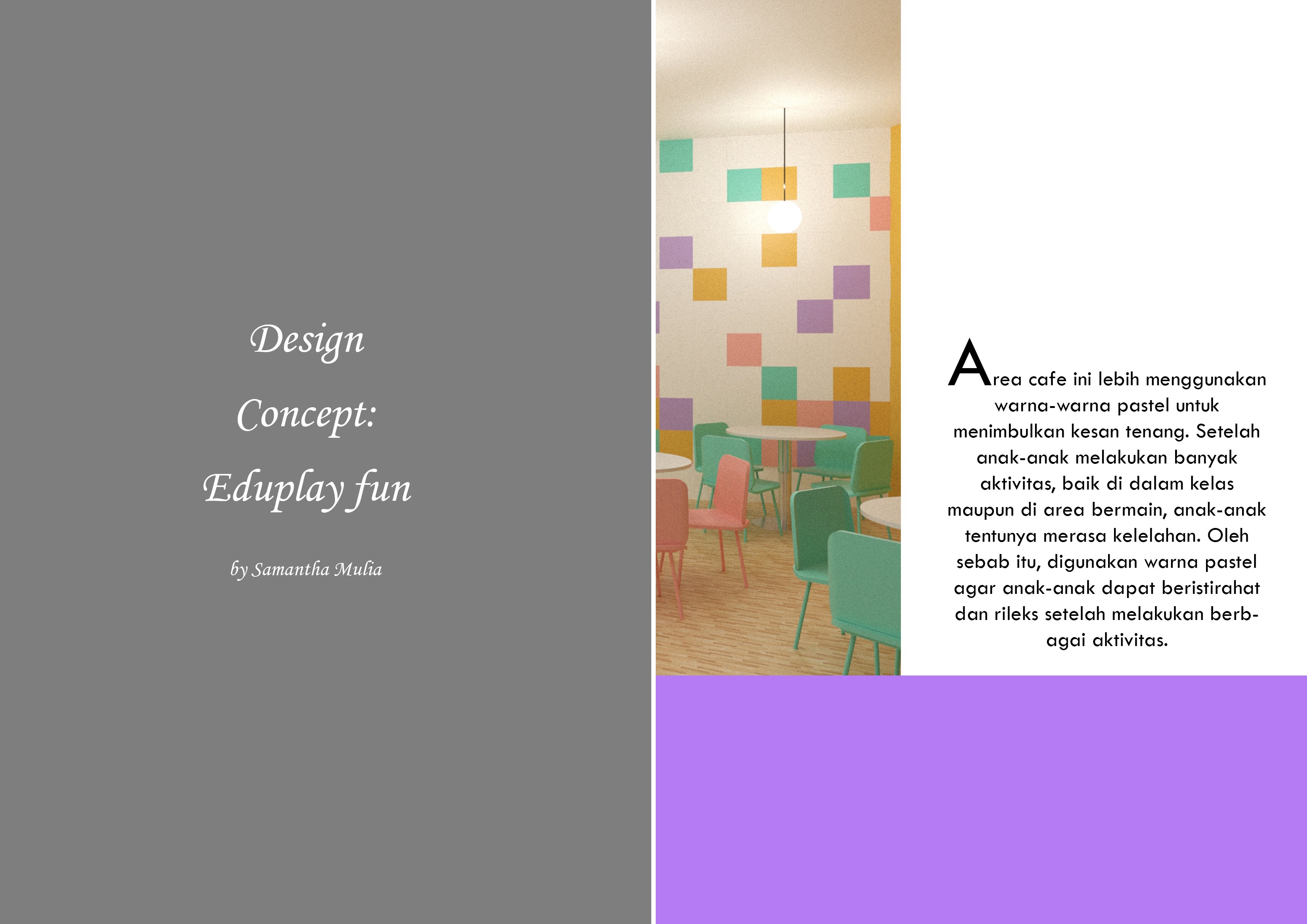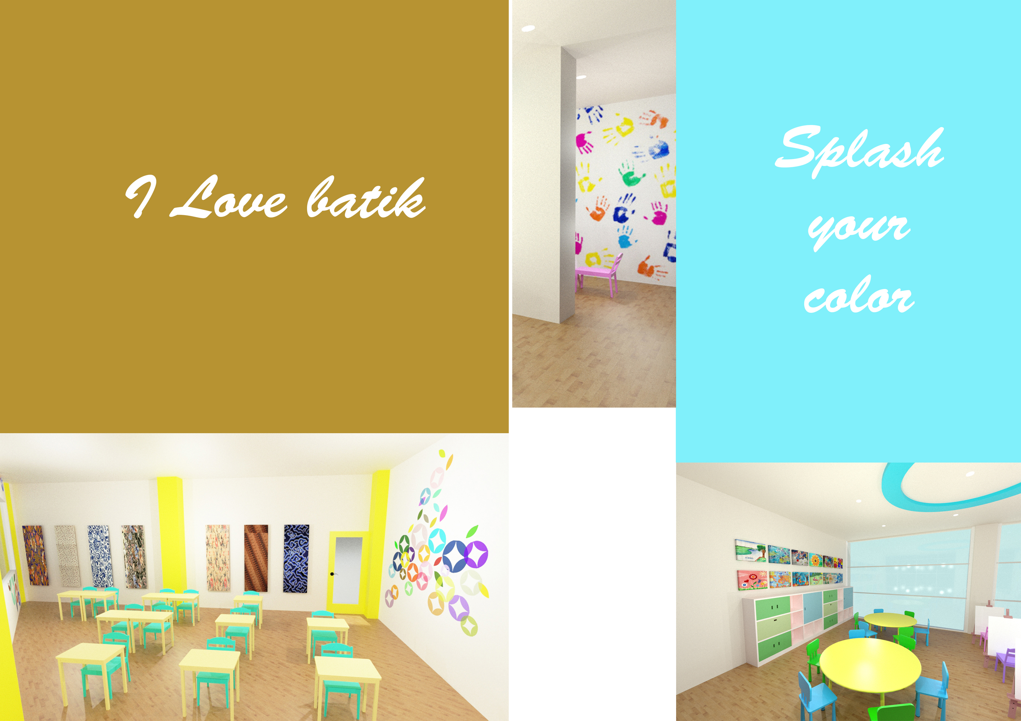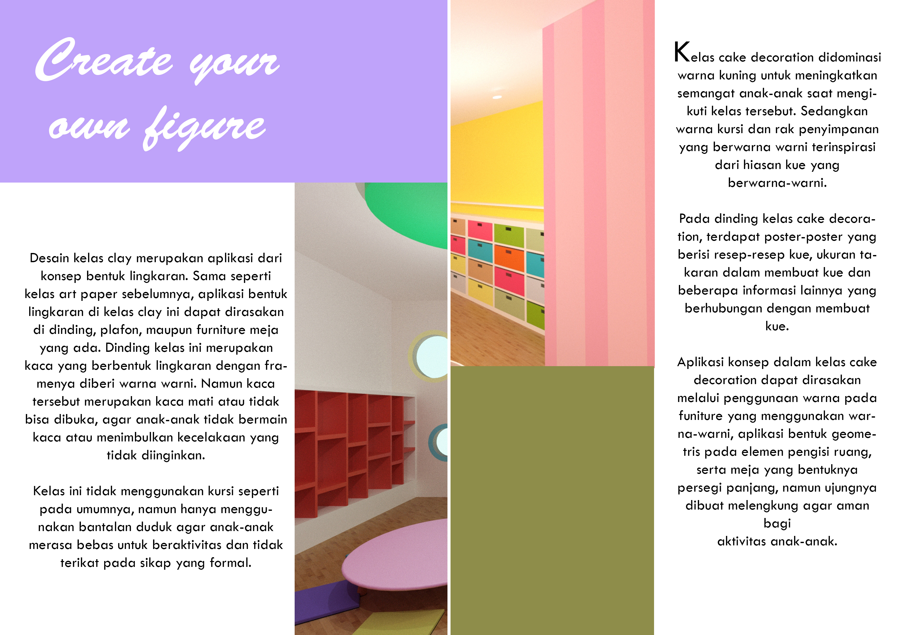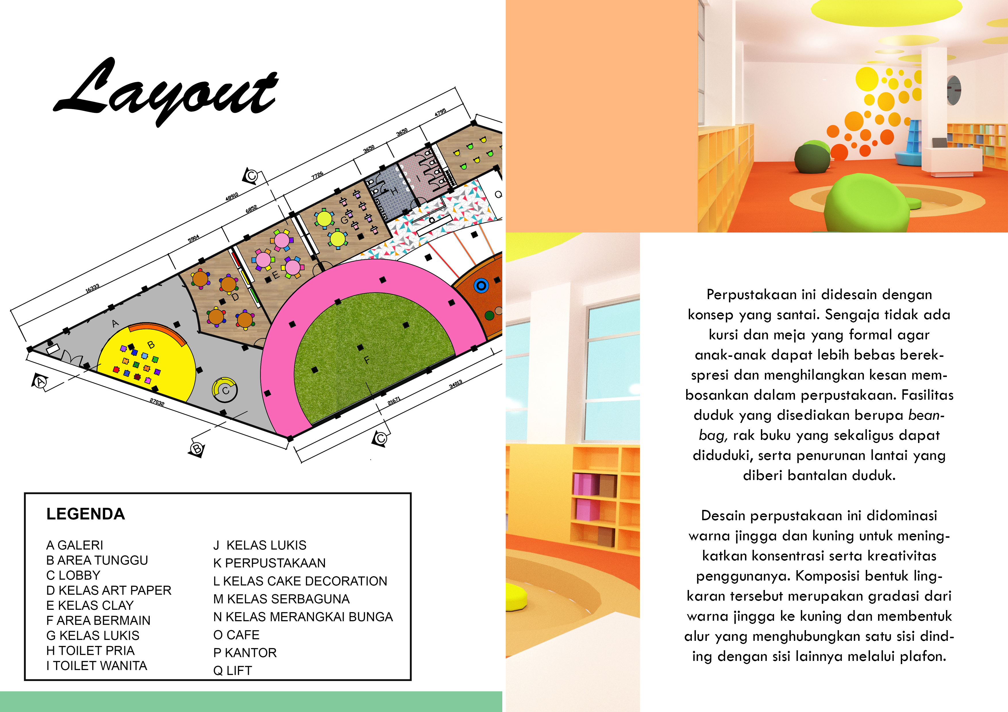 Anak-anak memiliki rasa ingin tahu dan kreativitas yang tinggi. Rasa ingin tahu dan kreativitas tersebut dapat diarahkan ke arah yang positif agar mereka menemukan bakat dan minatnya lebih dini. Kreativitas tersebut dapat disalurkan melalui seni. Perancangan ini menyediakan Pusat Pendidikan Seni bagi anak-anak untuk dapat mencoba hal baru serta meningkatkan kreativitas mereka sejak dini. Perancangan ini berisi fasilitas kelas-kelas seperti kelas lukis, clay, art paper, cake decoration, merangkai bunga, batik, kelas serbaguna dan fasilitas lainnya seperti perpustakaan, kafe, ruang kantor, lobi dan area bermain. Konsep “Eduplay and Fun” menciptakan suasana ruang yang menyenangkan serta menyesuaikan karakteristik masing-masing anak. Konsep diaplikasikan melalui permainan warna, bentuk dan ukuran.