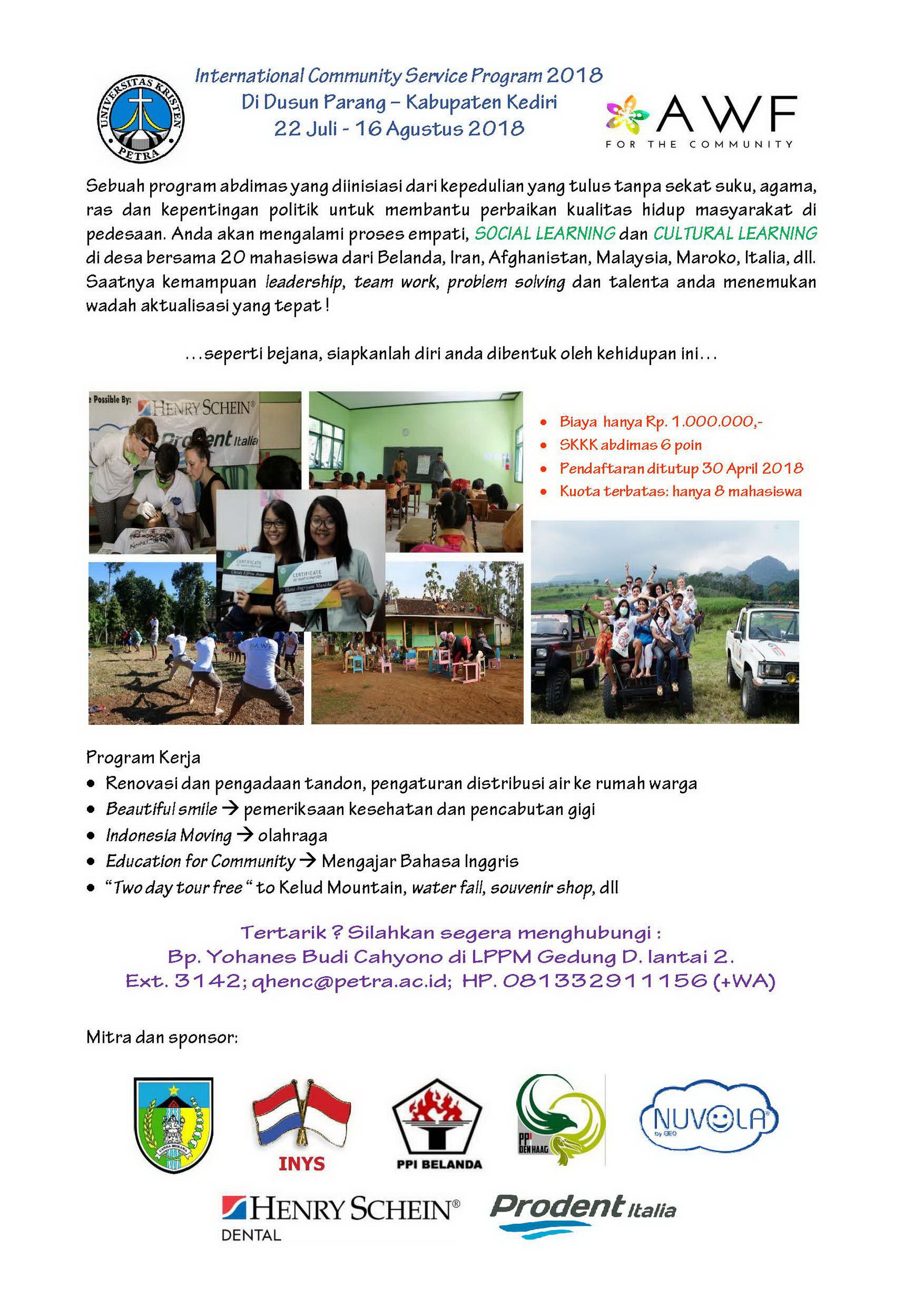 Lembaga Penelitian dan Pengabdian kepada Masyarakat UK Petra membuka pendaftaran bagi mahasiswa UK Petra dalam kegiatan International Community Service Program 2018. Kegiatan ini berlokasi di dusun Parang Kediri pada tanggal 22 Juli - 16 Agustus 2018.