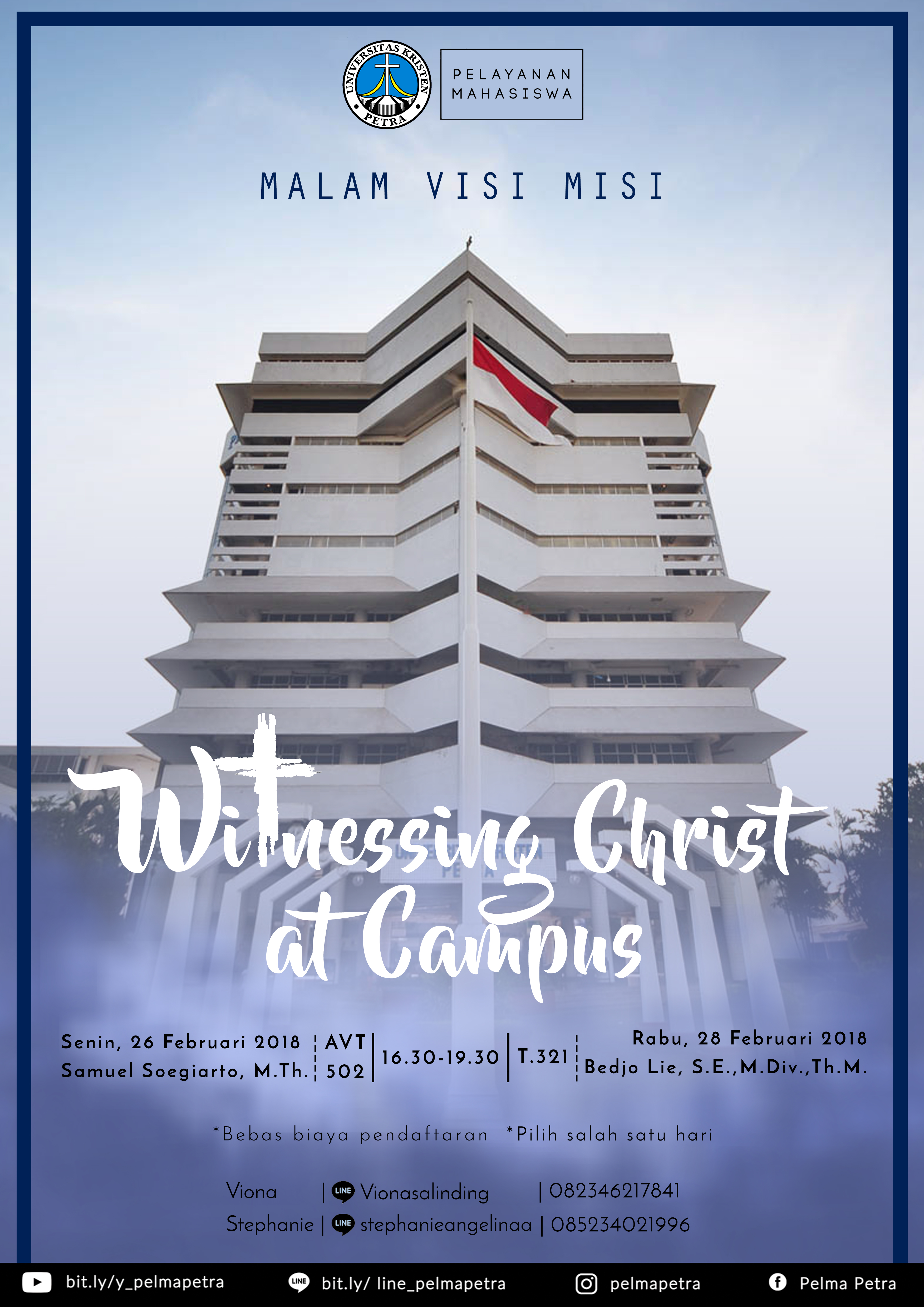 Pusat Kerohanian yang menaungi kegiatan Pelayanan Mahasiswa UK Petra mengadakan acara kebaktian malam visi misi Pelayanan Mahasiswa UK Petra dengan mengangkat tema "Witnessing Christ at Campus". Menghadirkan bapak Bedjo Liem dan bapak Samuel Soegiarto sebagai pembicara, acara ini dilaksanakan pada Senin, 26 Februari 2018 dan Rabu, 28 Februari 2018. Mahasiswa tinggal pilih hari yang diingini.