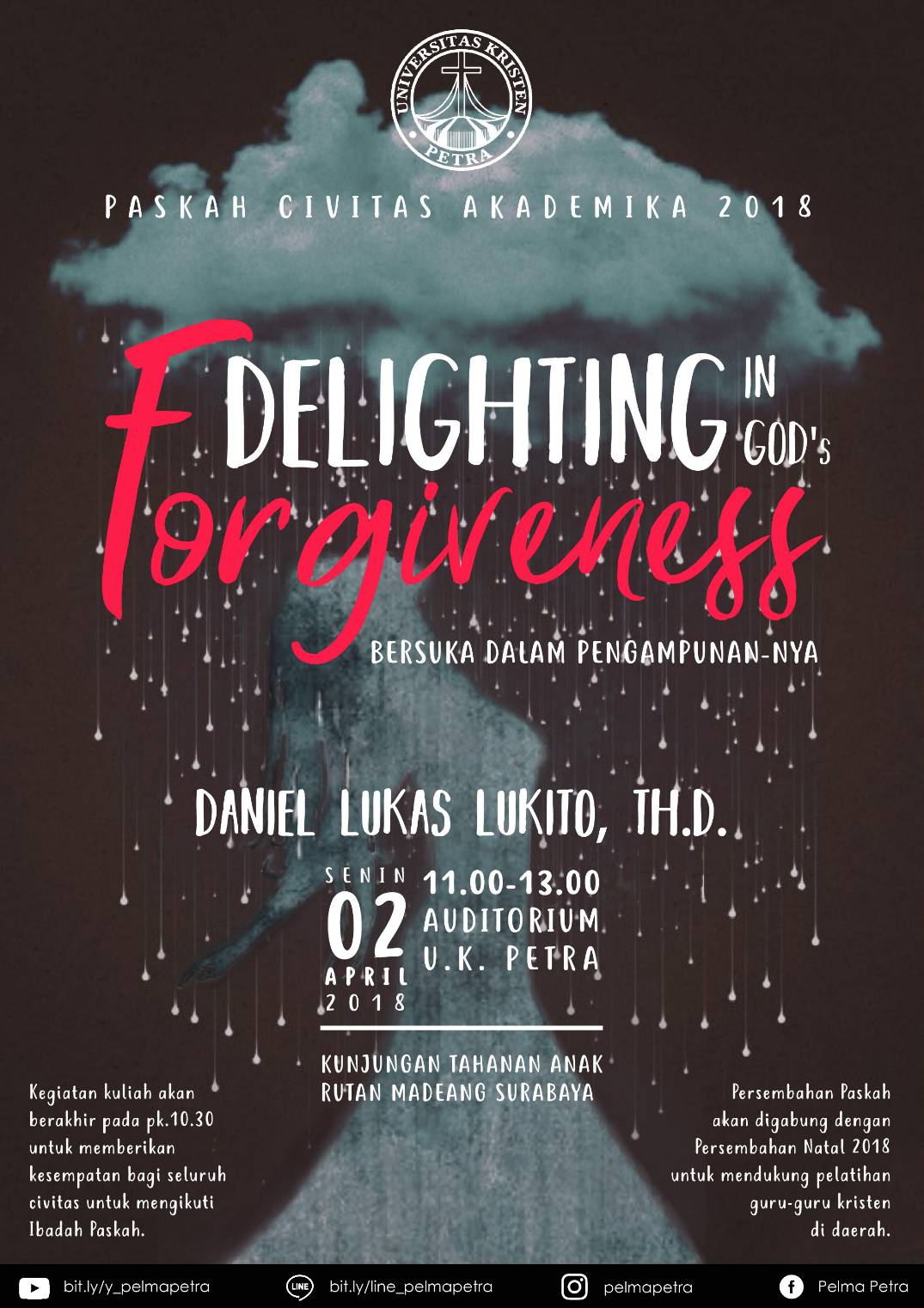 Universitas Kristen Petra Surabaya mengadakan acara kebaktian Paskah tahun 2018 pada tanggal 2 April 2018, bertempat di Auditorium UK Petra pada jam 11.00 - 13.00. Kebaktian Paskah ini akan dilayani oleh Daniel Lukas Lukito, Th.D. dengan mengambil tema Delighting in God's forgiveness (bersuka dalam pengampunannya).