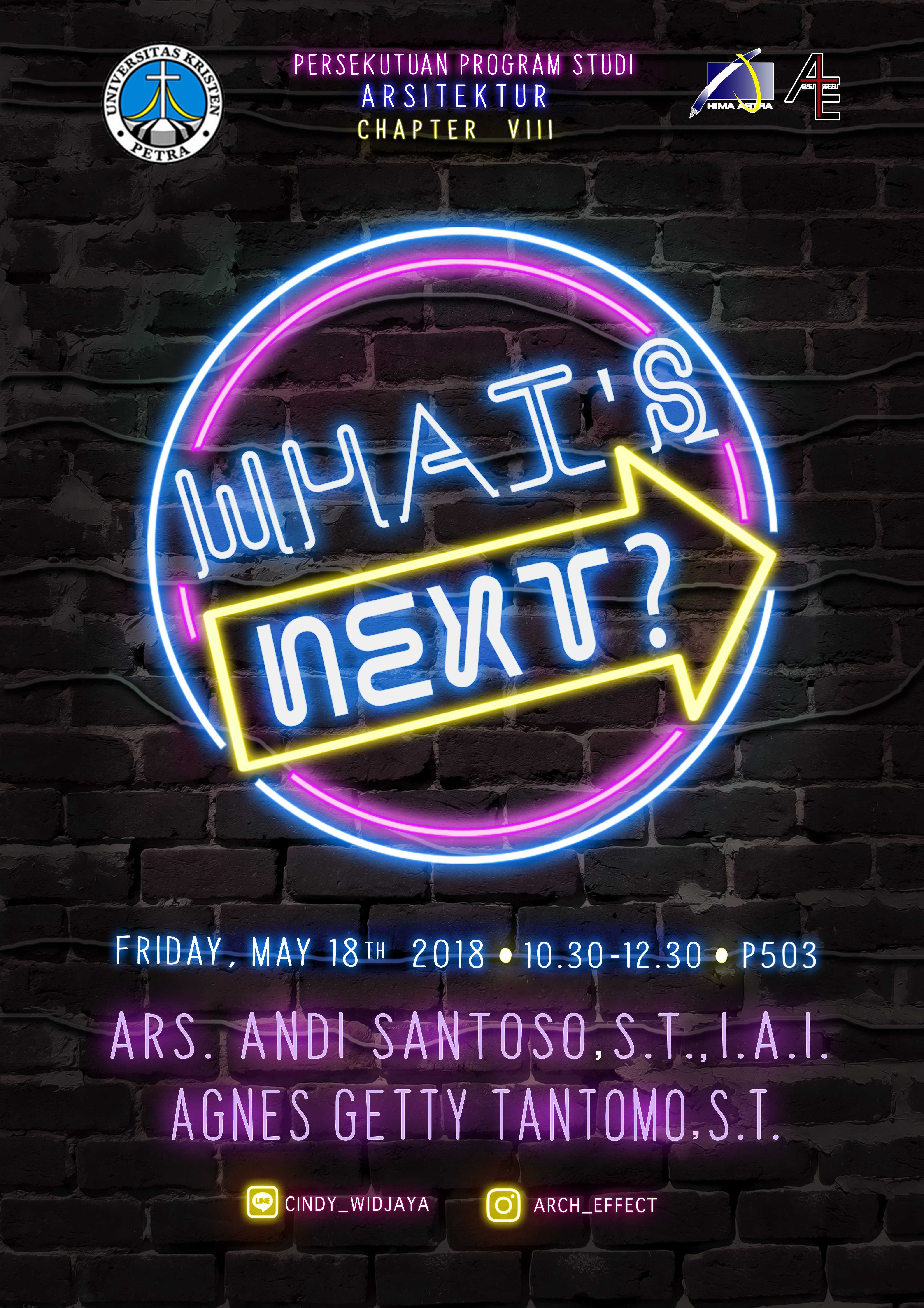 Program Studi Arsitektur UK Petra pada tanggal 18 Mei 2018 mengadakan persekutuan khusus mahasiswa Teknik Arsitektur. Kegiatan ini bertempat di gedung P.503. dengan mengambil tema What's Next dengan pembicara ARS. Andy Santoso dan Agnes Getty Tantomo.