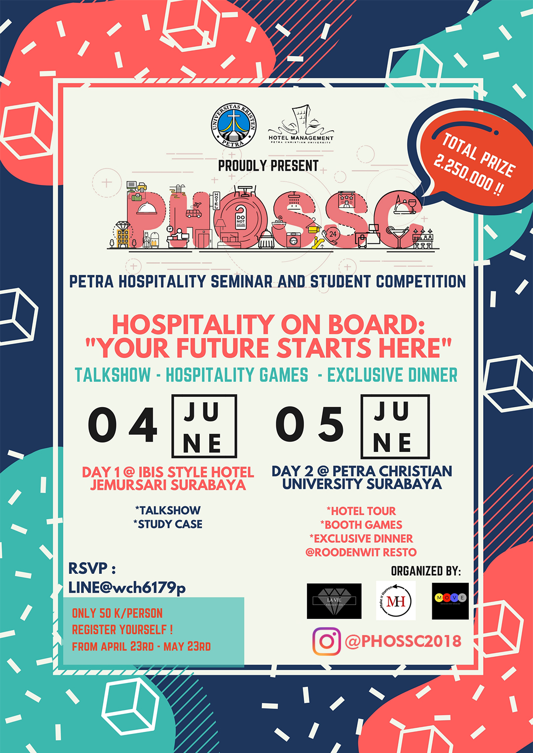 Program Manajemen Perhotelan UK Petra, mengadakan serangkaian kegiatan yang bernama Petra Hospitality Seminar and Student Competition (PHOSSC). Dengan mengambil topik "Hospitality on board: your future starts here" kegiatan ini diadakan pada 04 - 05 Juni 2018 bertempat di hotel Ibis Jemursari dan kampus UK Petra. Biaya pendaftaran 50.000 dengan memperebutkan total hadiah 2.250.000.