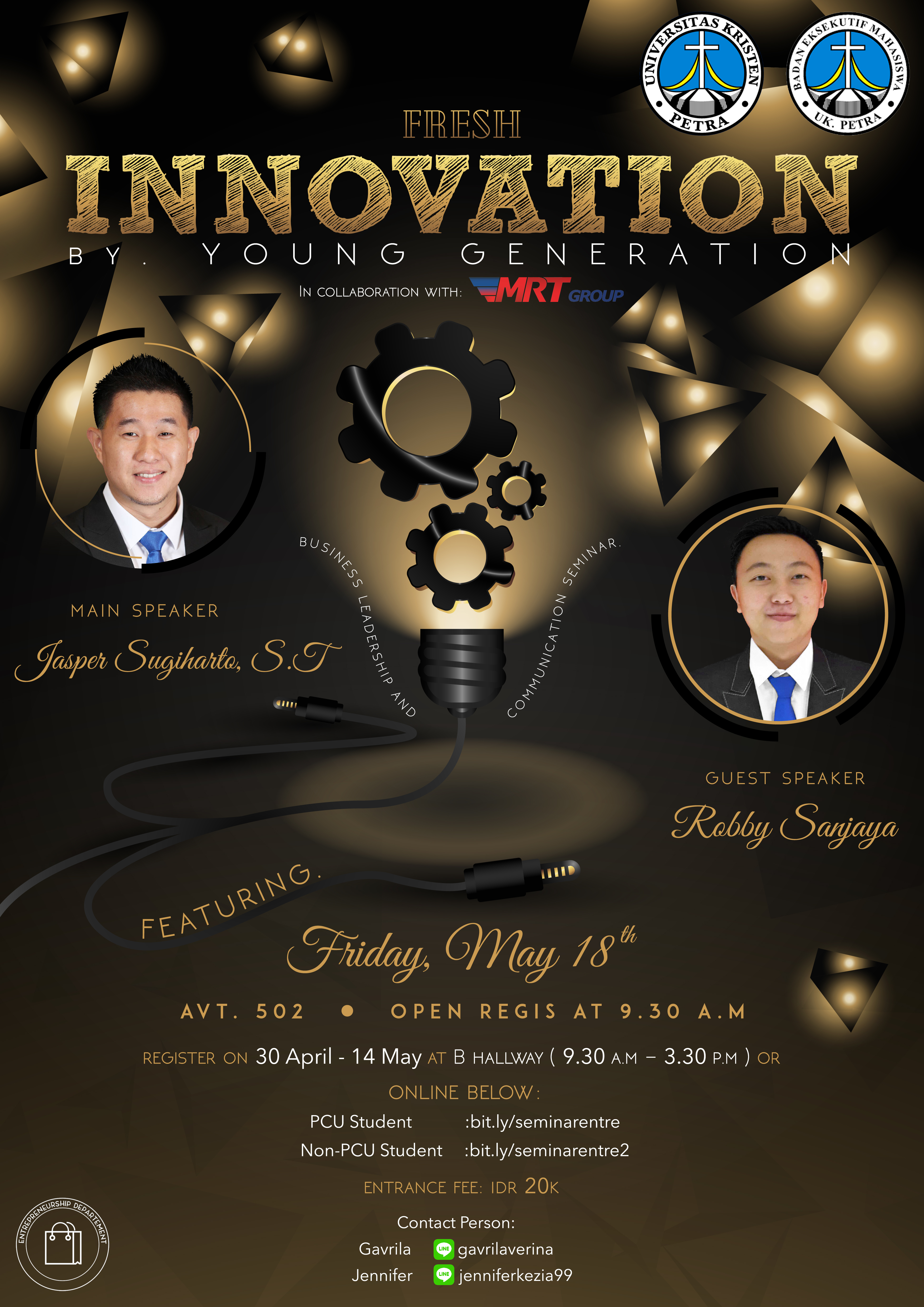 Seminar Entrepreneurship yang bertemakan "Innovation" diselenggarakan oleh Badan Eksekutif Mahasiswa. Acara ini delaksanakan pada18 Mei 2018 bertempat di gedung AV.T.502. Hadir sebagai narasumber Jasper Sugiharto dan Robby Sanjaya.