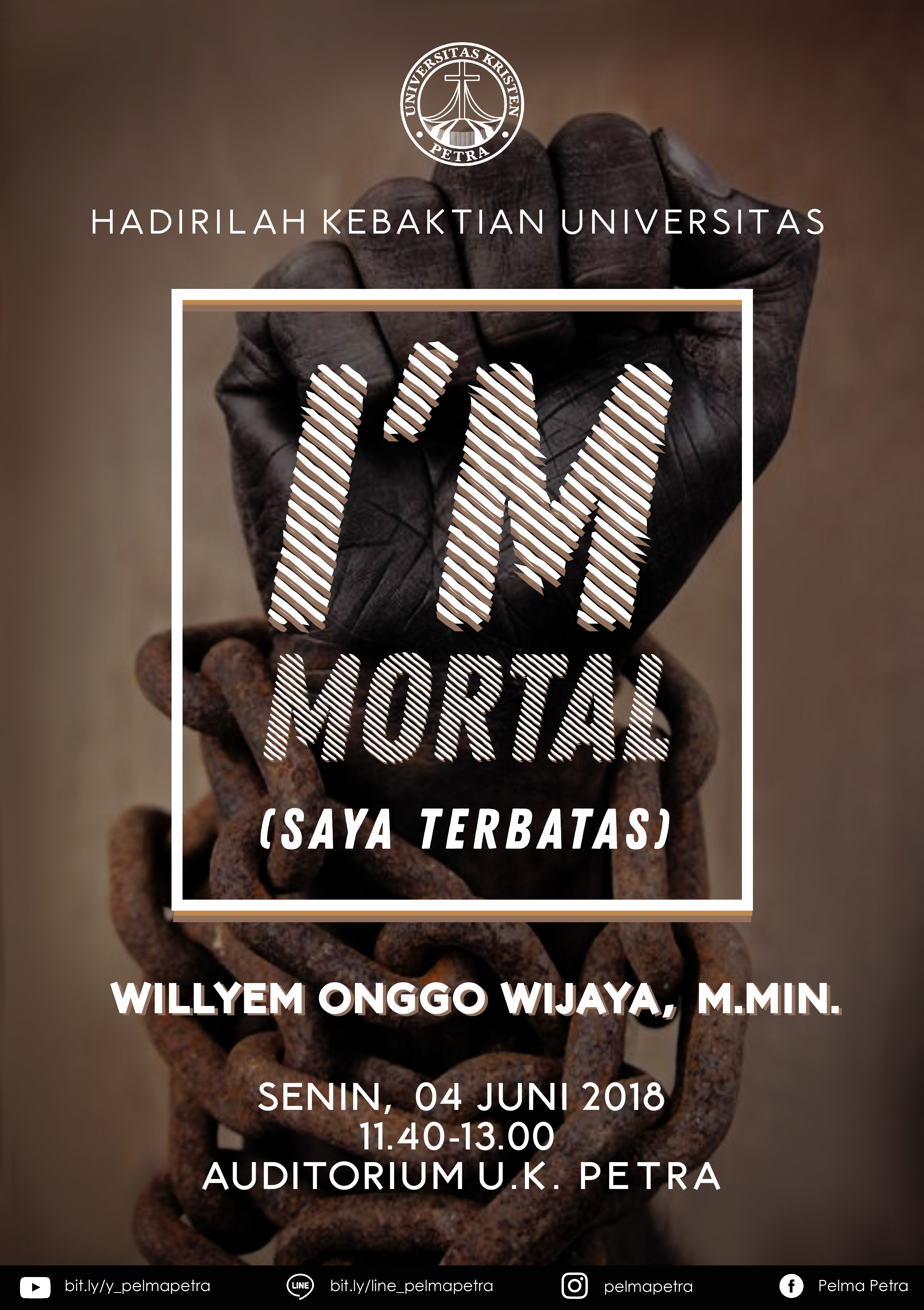 Universitas Kristen Petra mengundang seluruh sivitas untuk hadir dalam kebaktian Universitas setiap hari Senin. Pada tanggal 04 Juni 2018 bertempat di Auditorium UK Petra dengan menghadirkan bapak Willyem Onggo Wijaya, M.Min sebagai pengkhotbah kebataktian ini mengangkat tema I'm Mortal (saya terbatas).
