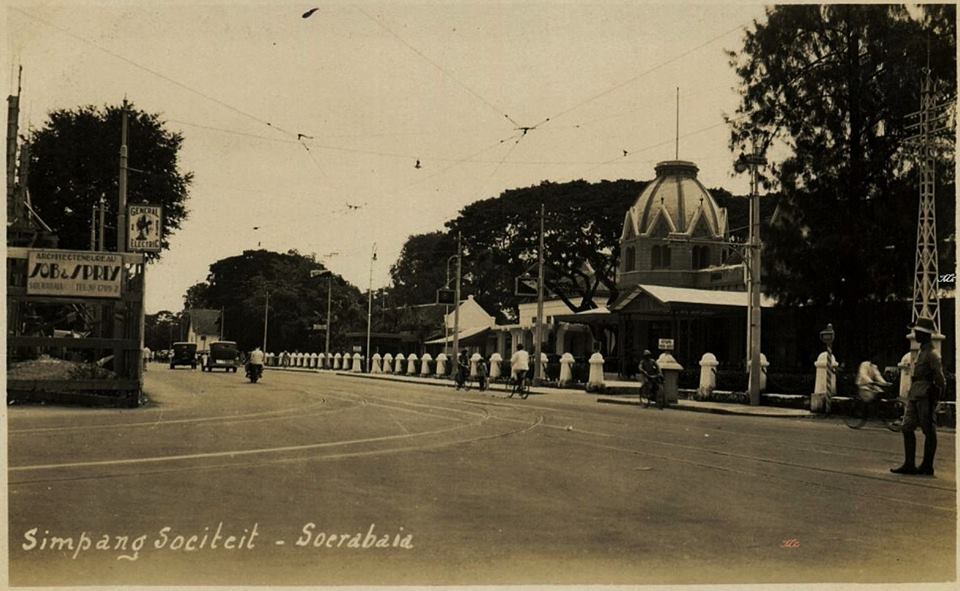 Persimpangan jalan Gubernur Suryo dengan jalan Pemuda (simpangstraat dengan latar gedung Balai Pemuda / Societeit Club) pada tahun 1920