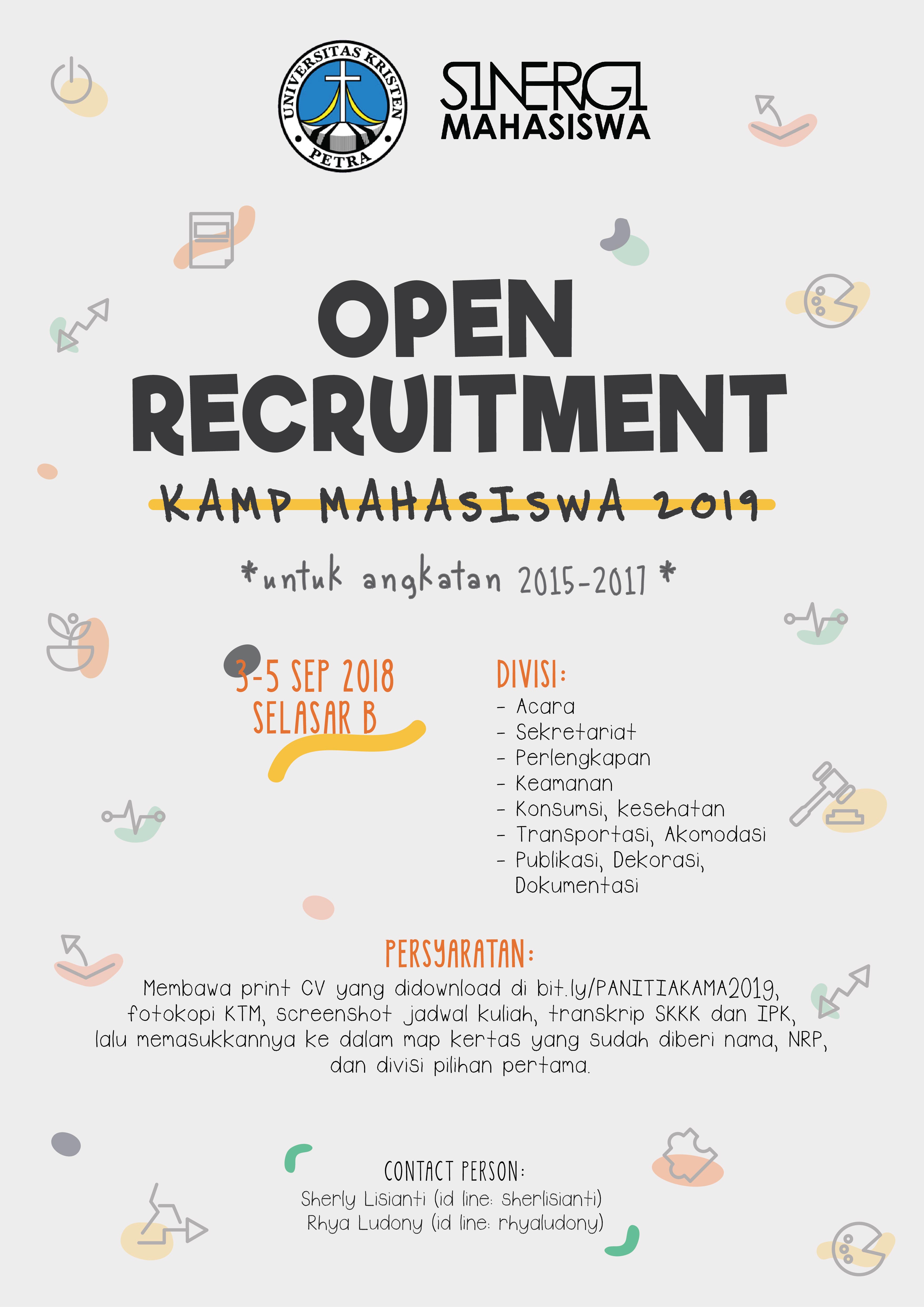 Pelayanan Mahasiswa (Pelma) Universitas Kristen Petra Surabaya, membuka kesempatan bagi para mahasiswa angkatan 2015-2017, untuk mendaftar menjadi panitia kamp mahasiswa tahun 2019. Pendaftran dibuka pada tanggal 3-5 September bertempat di selasar gedung B.