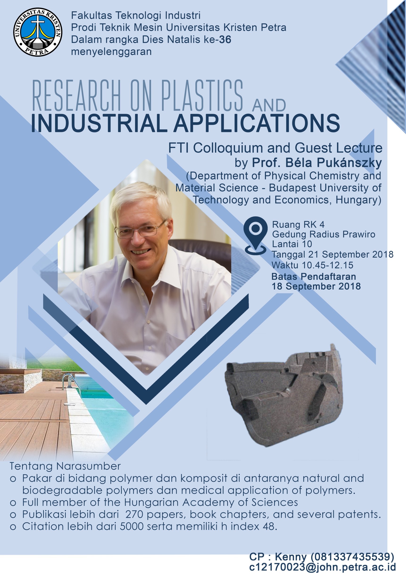 Dalam rangka Dies Natalis 36 Teknik Mesin Universitas Kristen Petra Surabaya mengadakan acara kuliah tamu dengan menghadirkan Professor Bela Pukanszky dari Hungaria. Acara ini dilaksanakan pada 21 September 2018 bertempat di RK IV gedung Radius Prawiro Universitas Kristen Petra Surabaya. Dengan mengangkat tema research on plastics and industrial applications.