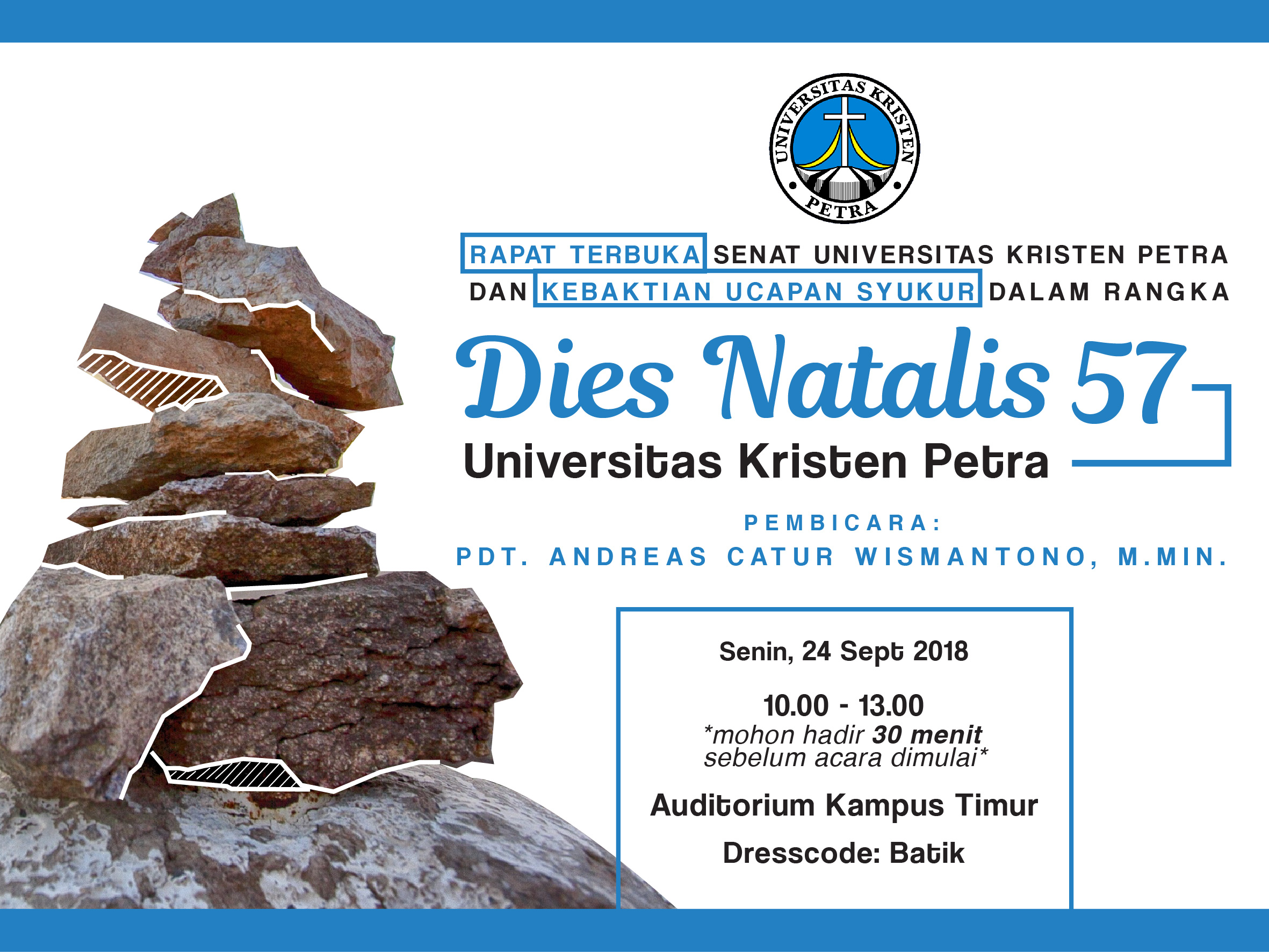Dalam rangka Dies Natalis ke 57 Universitas Kristen Petra Surabaya, Senat Universitas mengadakan rapat terbuka dan kebaktian ucapan syukur. Acara ini diadakan pada tanggal 24 September 2018 bertempat di Auditorium Kampus Timur Universitas Kristen Petra Surabaya. Dengan menghadirkan bapak Andreas Catur Wismantono sebagai Pengkhotbah.